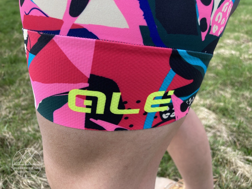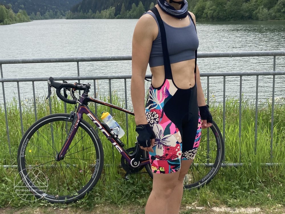 Das Muster findet sich an den Seiten und an den Beinabschlüssen. Die Mitte vorne und hinten sowie die Träger sind schwarz. An den Beinabschlüssen außen findet man in neongelb das Label „Alé“. Der Stoff ist weich und elastisch, auf Zug dann doch recht fest. Die Träger sind aus einem atmungsaktiveren Stoff gefertigt. Insgesamt ist das Material extrem leicht und dünn und für (afrikanisch) heiße Bedingungen ausgelegt.