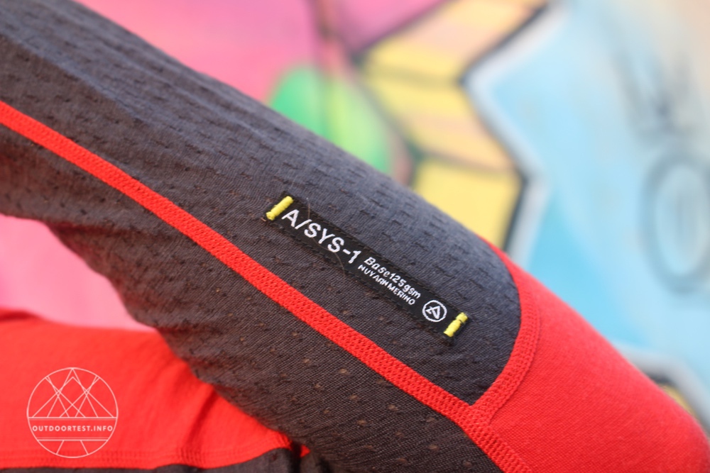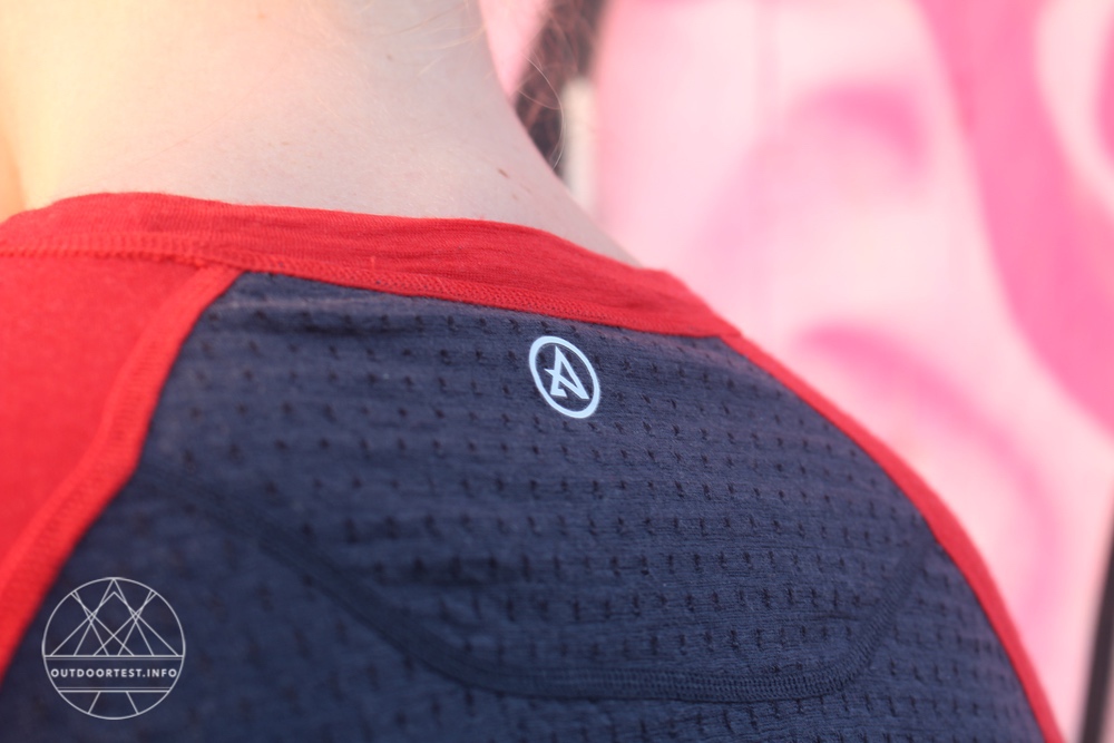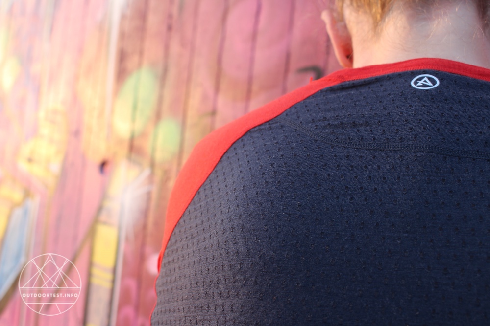 Wirklich gelungen ist die Farbkombination aus leuchtendem Rot und schlichtem Grau. Der Stoff fühlt sich leicht rau an, so wie das bei Merino üblich ist. Der dunkle Stoff wurde mit vielen Löchern versehen, so dass die Haut darunter sehr gut atmen kann.