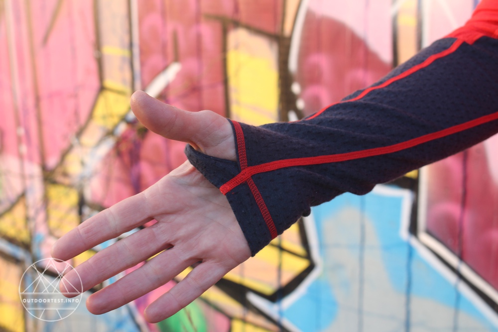 Des weiteren wurden zwei Daumenschlaufen und eine innere Schlaufe im hinteren Halsbereich integriert. Damit kann es problemlos zum Trocknen aufgehängt werden.