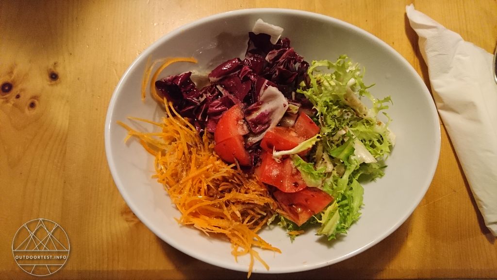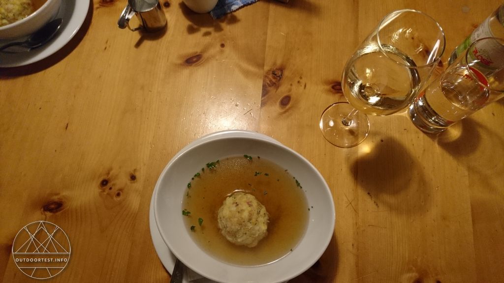 Es gab 4 Gänge, einer leckerer als der andere. Beginnend mit einer Speckknödelsuppe, die so schmackhaft war, dass wir auch gut einfach noch zwei Teller Suppe hätten essen können, ging es genau so weiter. Ein gemischter, sehr knackiger Salat war der zweite Gang. Dem folgten Kartoffeln-Frischkäse-Taschen in zerlassener Butter. Auch hiervon hätten wir gerne mehr gegessen. Aber dann kam die Hauptspeise. Kalbssteak mit selbstgemachten Schupfnudeln und Gemüsesticks. So unglaublich gut.