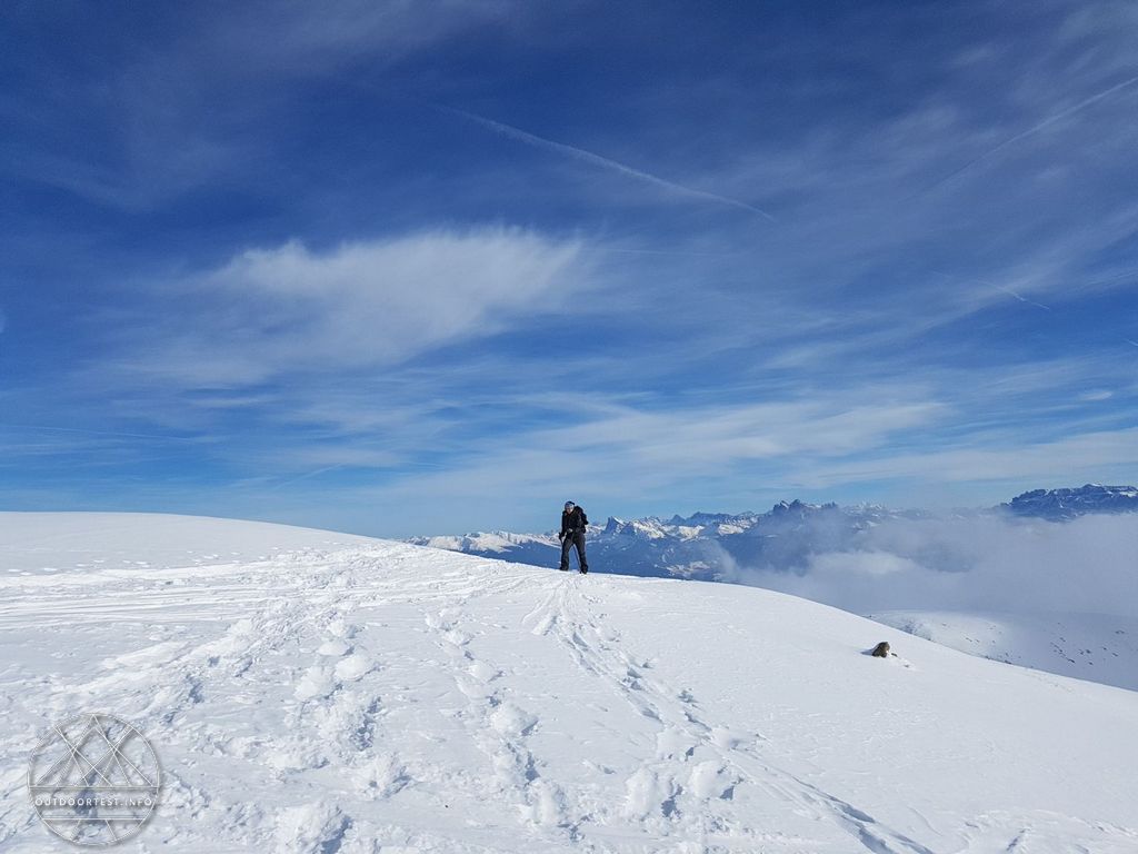 Nachdem wir einen wunderschönen Sonnenaufgang vom Bett aus erleben durften, konnten wir uns bei einem guten zünftigen Frühstück stärken. Um halb zehn starteten wir dann, inzwischen doch ganz schön nervös, in unser Abenteuer. Das Wetter sollte ganz gut werden für heute und morgen dann Schnee. Also von allem etwas. Im Tal unten hatte es nahezu keinen Schnee, auf halber Höhe hatte es je nach Hanglage auch immer wieder grüne oder braune Flecken. Viel Schnee war das nicht für Mitte Januar. Wie es wohl oben ist?