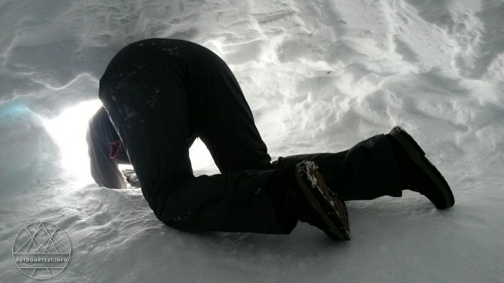 Nun statteten wir uns mit Isomatte, Plane, Daunenschlafsack und Kissen aus. Zudem bekamen wir noch eine dünne Matte, um sie vor das Eingangsloch zu stellen, damit es nicht zieht. Bis wir uns eingerichtet hatten, war uns ordentlich warm. Zwischenzeitlich hatte es sich eingeschneit und es war sehr winterlich idyllisch. Mit der niedrigen Deckenhöhe, war das Umziehen und Einrichten gar nicht so einfach. In unserer Schneehöhle war es absolut still und nachdem wir die Stirnlampen ausgeschaltet hatten auch stockdunkel. Das war schon erst einmal gewöhnungsbedürftig. In unseren dicken Daunenschlafsäcken war es aber angenehm warm und so starteten wir in unsere Winternacht. Für Menschen mit empfindlichem Rücken ist das nicht gerade eine erholsame Nacht. Die Isomatte war doch recht hart und so wurde es eine unruhige aber dennoch unvergessliche Nacht. Sie endete recht früh, dank Schneefall leider ohne Sonnenaufgang aber mit knackig kalten -5 Grad.
