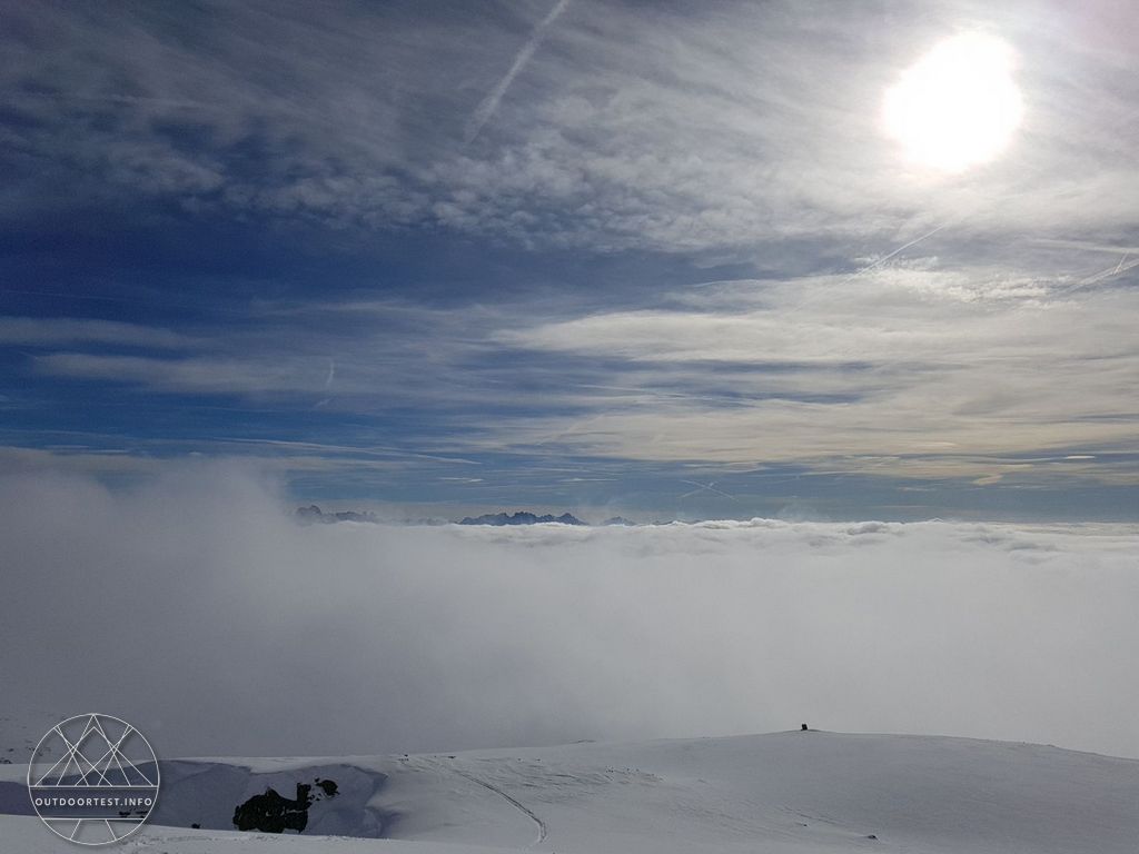 Es wurde stetig steiler und auf dem Bergkamm Richtung Gipfel machten wir eine erste Trinkpause und zogen uns an, den hier oben pustete der Wind ordentlich. Auf der anderen Seite, im Nachbartal zog Nebel auf, der das Tal wie ein Meer füllte. Ein wunderschöner Anblick! ….allerdings nur, wenn man oberhalb der Nebelgrenze bleibt.