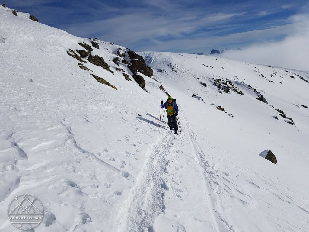 Zunächst ging es dann um 13.20 Uhr wieder ein Stück weit über den Grat zurück. Nachdem wir uns mit unserem Bergführer beim Aufstieg über LVS (Lawinenverschüttetensuch)-Geräte und ein wenig Lawinenkunde unterhalten hatten, verteilte Matthias vor dem Aufbruch am Gipfel LVS-Geräte und wir aktivierten diese.
