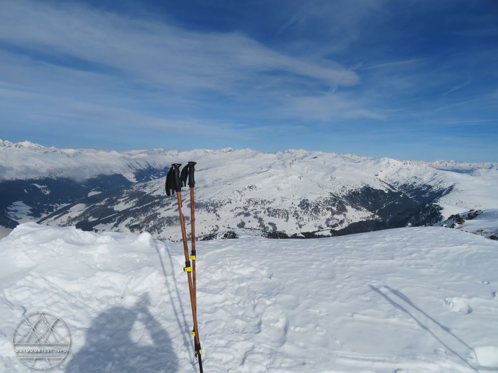 Uns war ordentlich warm, obwohl der Wind heftig blies. Die Sonne belohnte uns bei unserer 20-minütigen Gipfelrast mit wärmenden Strahlen trotz kaltem Wind und beschien die schneebedeckten Gipfel ringsum. Eine redlich verdiente und gemeinsam geteilte Tafel Schokolade stärkte uns für den Abstieg.
