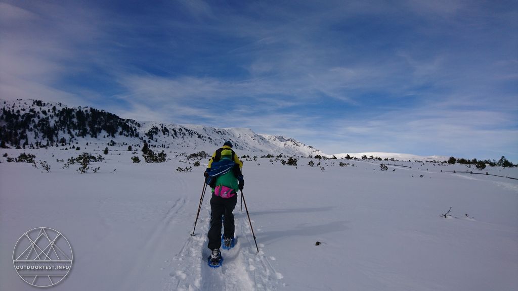 Das Wetter war traumhaft! Sonne und blauer Himmel mit ein paar Schleierwolken und zumindest im Kessel um den Parkplatz kein Wind. Wir erhielten unsere Leihschneeschuhe, stellten sie und unsere Teleskopstöcke auf uns ein und schon ging es los.