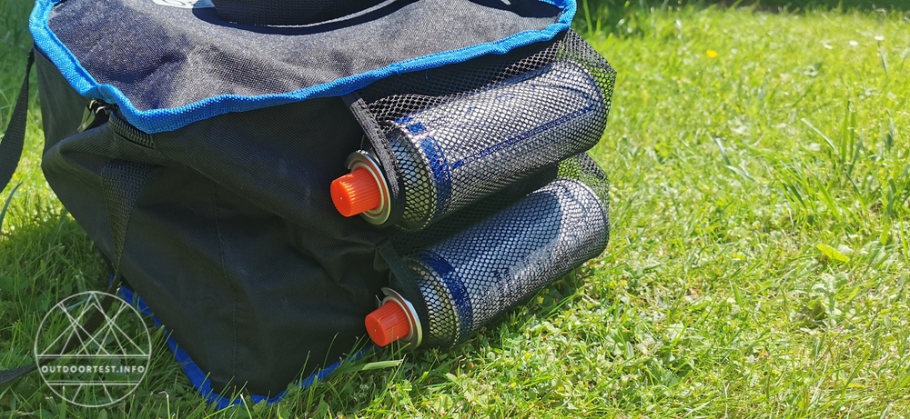 Der Cadac Safari Chef 30 Compact kommt tatsächlich kompakt verpackt in einer praktischen Tragetasche daher, an welcher man auf der Außenseite 2 Gaskartuschen einpacken kann.