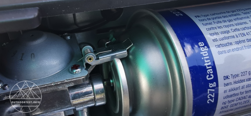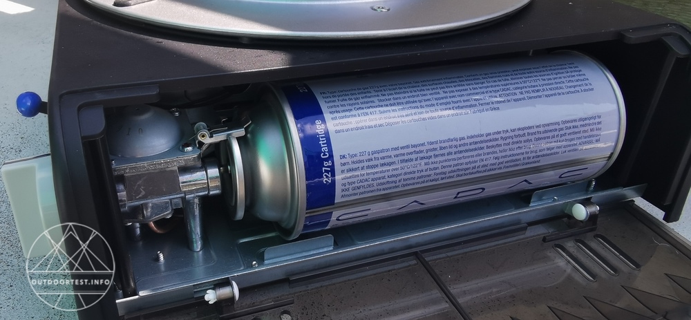Man öffnet auf der rechten Seite den Kunststoffdeckel und fügt hier die Gaskartusche ein. Dies ist nicht schwierig, da an der Kartusche oben am Rand eine Einkerbung ist, welche in dem Fach am Grill ein Gegenstück hat. Daher die Kartusche so hindrehen, dass die Nase im Grill in die Einkerbung der Kartusche passt.