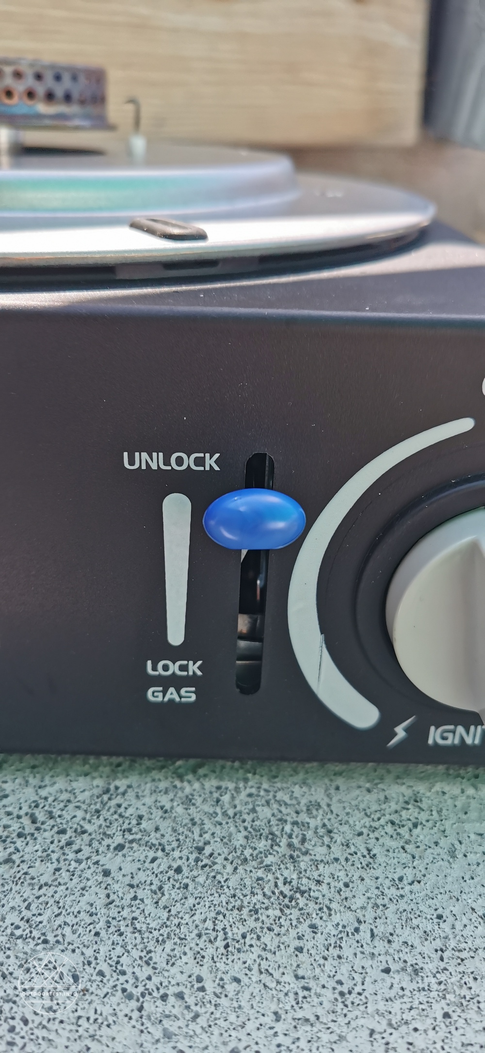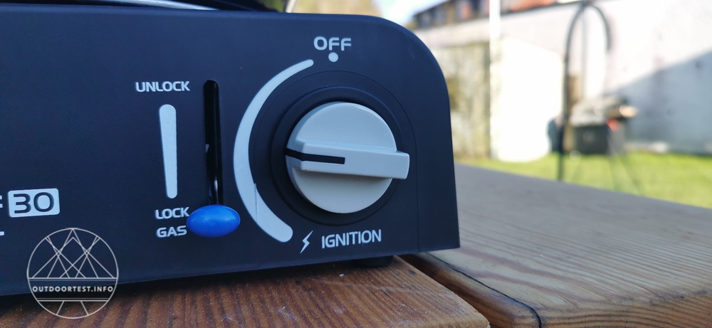 Nun dreht man den Gasregler ganz nach links auf. Am Ende merkt man einen kleinen Widerstand. Wird dieser überwunden, zündet der Piezo am Brenner, um das Gas zu entzünden.