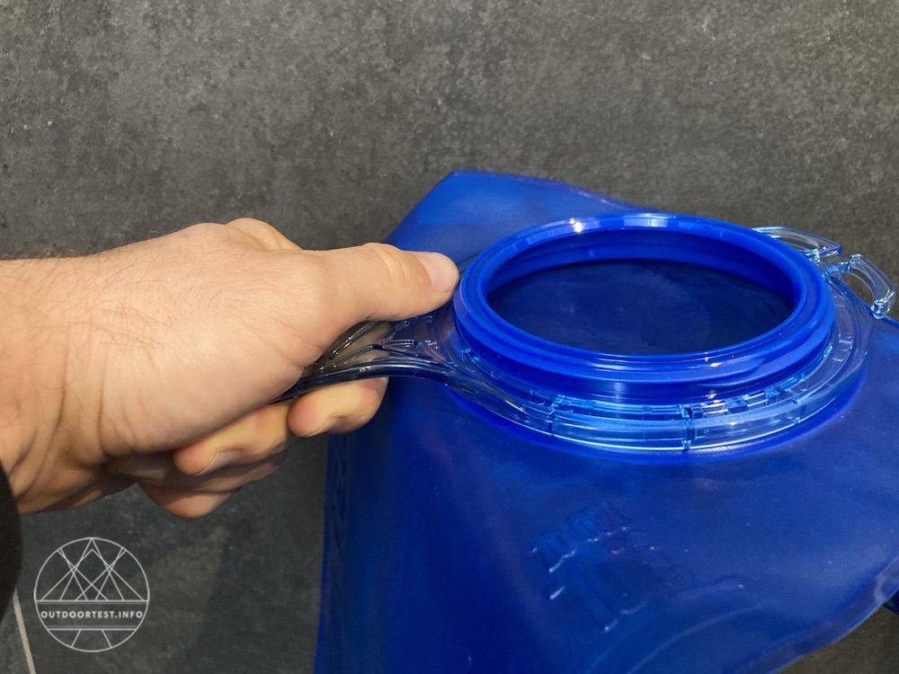 Das Befüllen ist sehr einfach. Durch den großen Griff an der Öffnung, lässt sich die Trinkblase mit einer Hand locker halten und befüllen. Der Deckel ist fest mit der Öffnung verbunden und dadurch ist die Gefahr des Verlierens nicht gegeben.