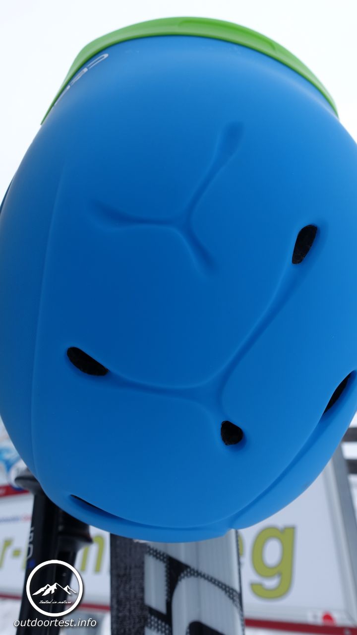 Auf der Helmoberseite befinden sich 6 Lüftungslöcher mit Mesheinsatz, die in drei Cébé-Zeichen integriert sind.