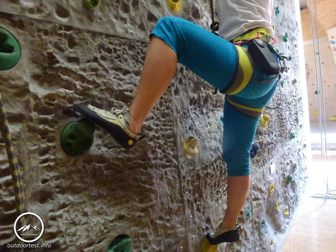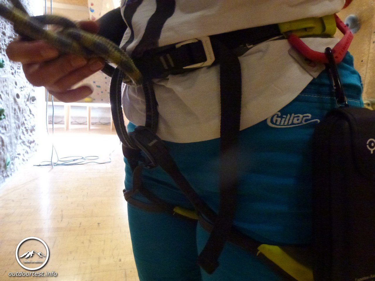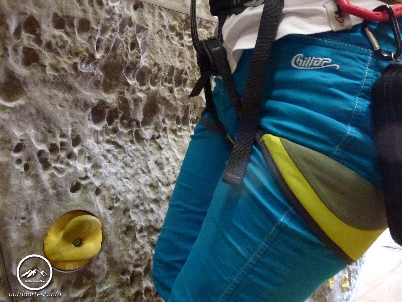 Der Hosenbund ist aus einem weichen und glänzenden Material. Er ist gut dehnbar und ist nieder geschnitten. Weder ein Knopf noch eine Kordel können durch die “Schlupf”-Variante unter dem Klettergurt oder wobei auch immer drücken. Leider ist er bei Größe 38 etwas zu weit. Die restliche Hose passt aber sehr gut. Aus diesem Grund rutscht der Bund hier immer wieder etwas. Mit Klettergurt ist dies unwichtig, da hält dieser alles zusammen. Aber im Alltag oder beim Bouldern sitzt sie etwas zu locker.