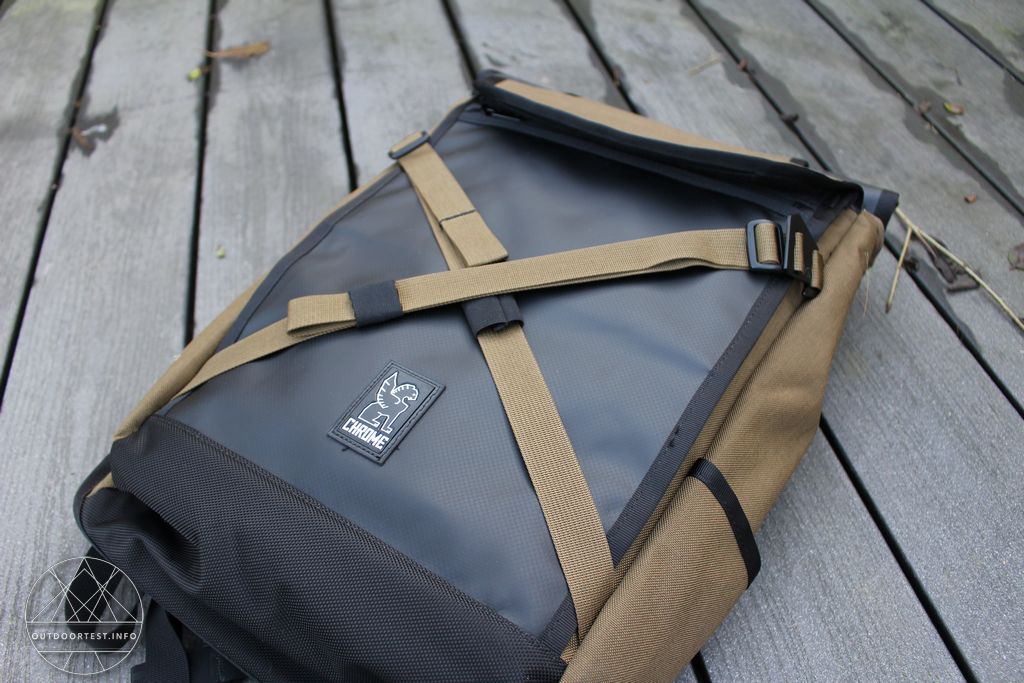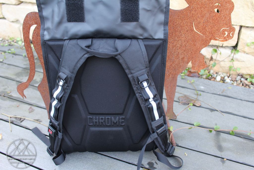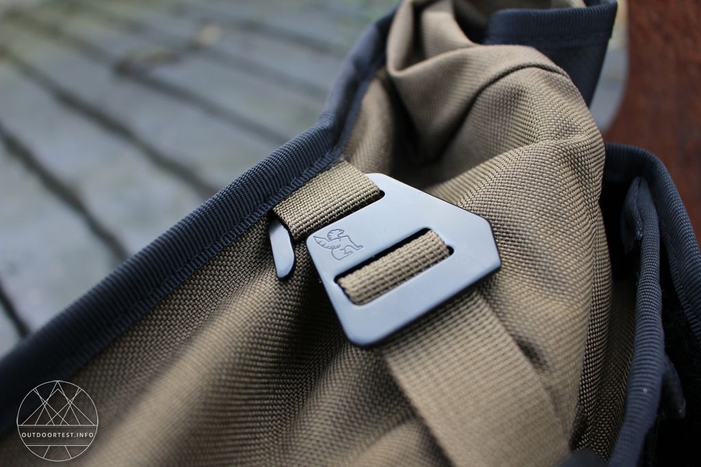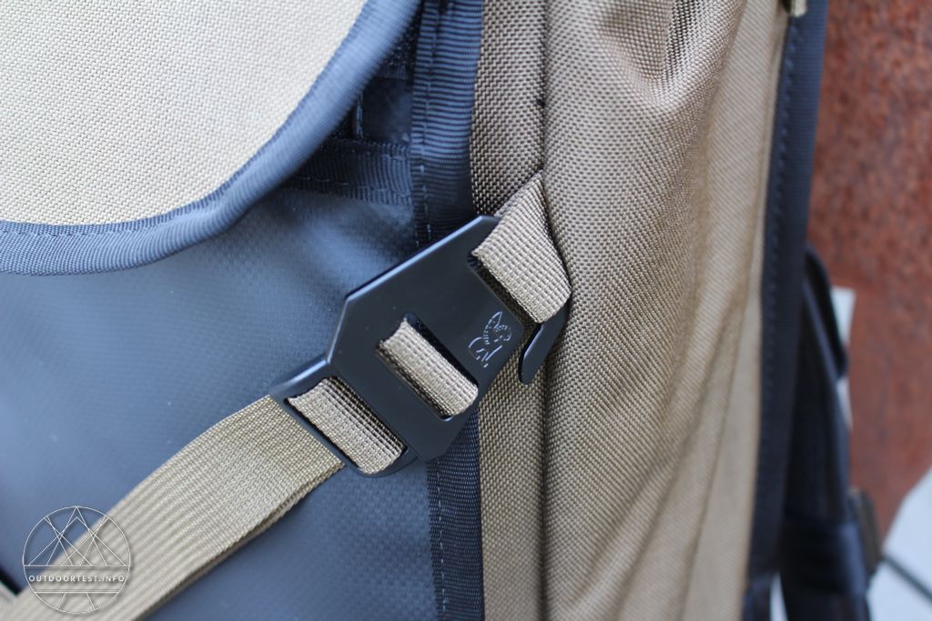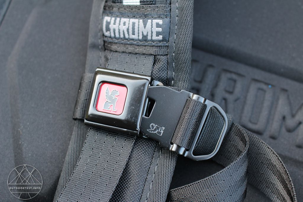 Der Brustgurt ist in der Höhe verstellbar, so wie man es von anderen Rucksäcken auch kennt. Als Verschluss kommt hier das Markenzeichen von Chrome zum Einsatz. Der „Metal Buckle“ ist ein auffälliger Steckverschluss mit dem prägnanten schwarzroten Greif-Logo. Durch diesen Verschluss ist ein schnelles Öffnen und Schließen problemlos möglich.