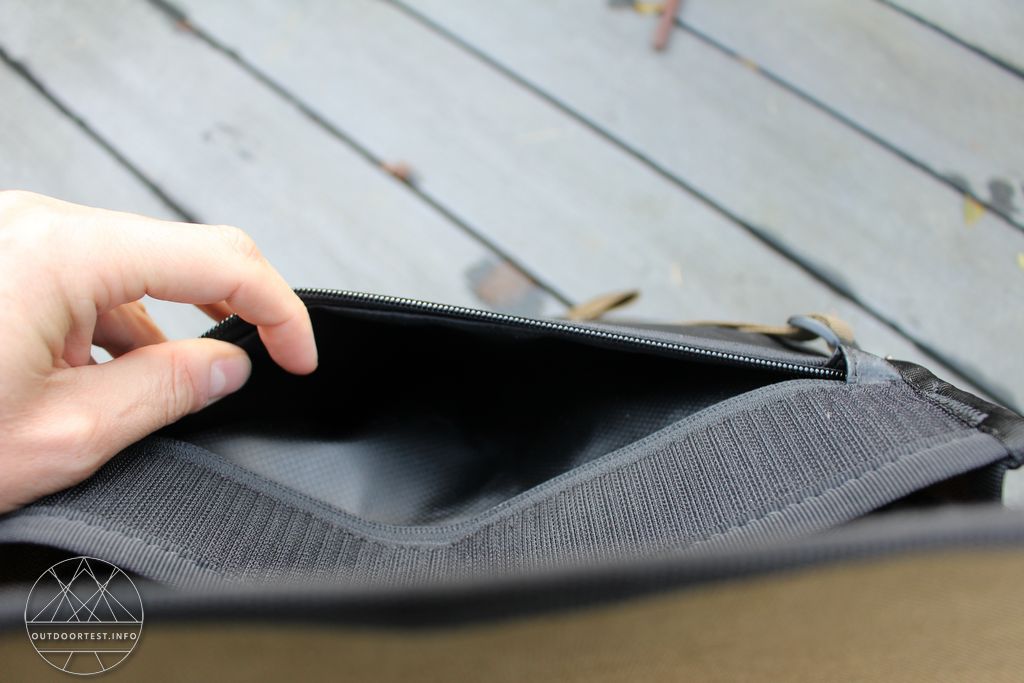 Auf dem Außenfach selber ist noch eine Tasche vorhanden, welche mit einem Reißverschluss verschlossen wird. Diese ist nicht unterteilt und der Deckel mit Klettverschluss von dem Außenfach reicht über den Reißverschluss drüber, so dass dieser abgedeckt ist.