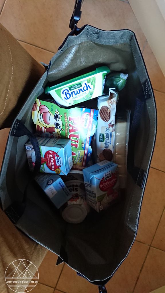 Beim ersten Einkauf war ich mir noch nicht ganz sicher, ob tatsächlich alles reinpasst, aber es hat geklappt. Auch wenn der Rucksack nur noch mit Müh und Not zugegangen ist. Hier waren die verstellbaren Schnallen ein Segen.