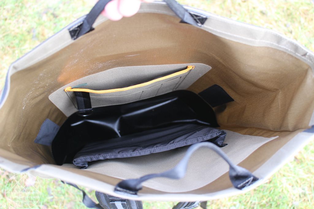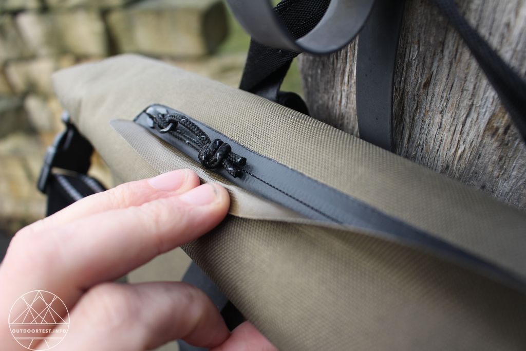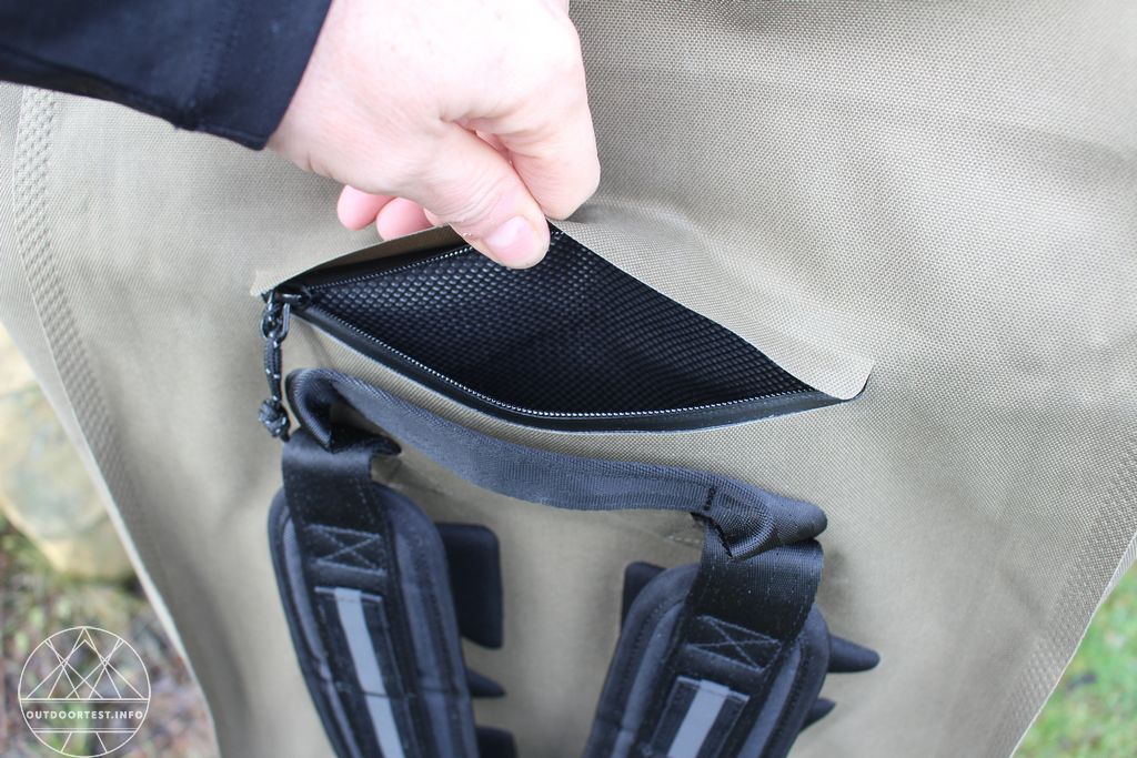 Außen hat der Rucksack am Rückenteil, oben beim Rollverschluss, noch eine Tasche, die mit einem wasserdichtem Reißverschluss versehen ist. Die Tasche geht nach unten weg, so dass man auch bei geschlossenem Rollverschluss noch etwas darin aufbewahren kann.