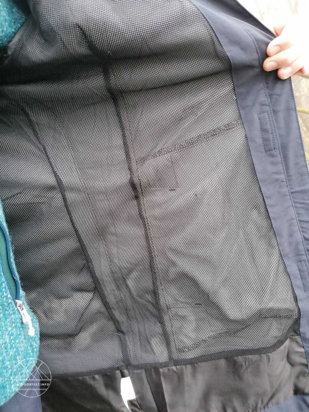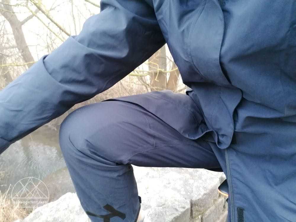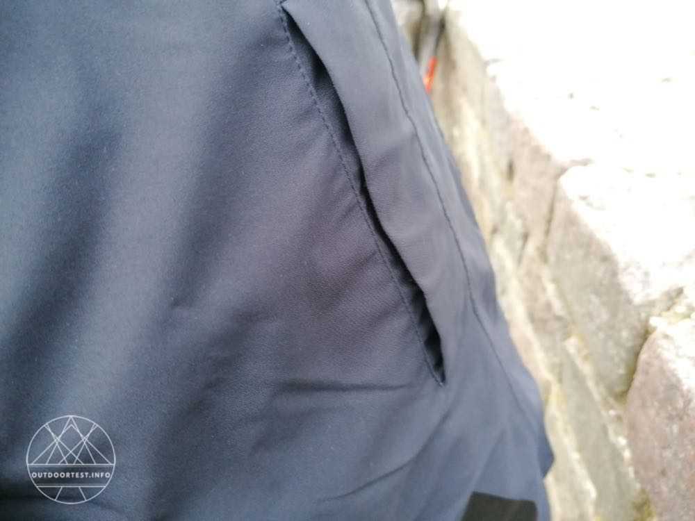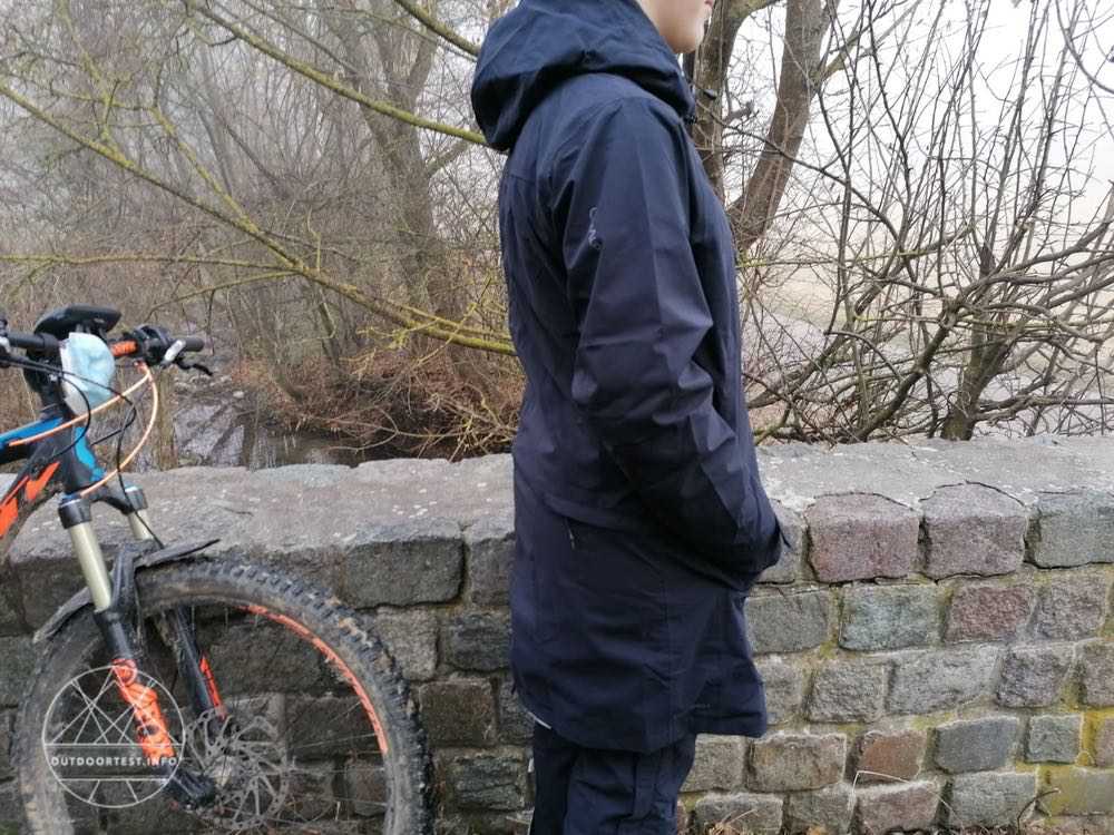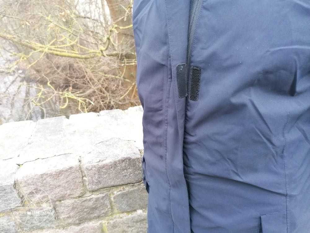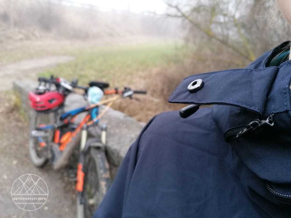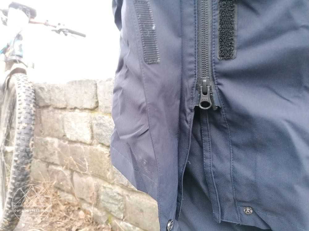 Neben einem 2-Wege-Reißverschluss, mit dem man ebenfalls die Bewegungsfreiheit erhöhen kann, kann die Jacke zusätzlich oder stattdessen mit mehreren Klettverschlüssen verschlossen werden. Damit ist die Kälte- und Windbrücke durch den überlappenden Streifen geschlossen. Der Reißverschluss geht nur bis 10 vor dem unteren Ende der Jacke. Wird der Reißverschluss von unten geöffnet hat man absolut keine Einschränkung durch die Länge des Mantels beim Gehen oder Radeln. Zwei Einschubtaschen sind mit einer Überlappung vor Regen geschützt und können mit einem Klettstreifen geschlossen werden. Rechts im Bereich des Gesäßes befindet sich eine Reißverschlusstasche. So stört ein Mobiltelefon zum Beispiel beim Radeln nicht den Bewegungsablauf. Auch eine Radkarte findet hier von der Größe her Platz.