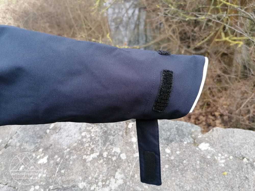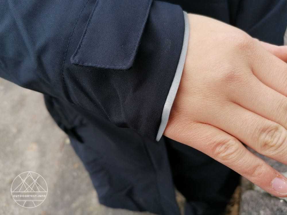 Die Ärmel sind so lang geschnitten, dass sie auch mit ausgestreckten Armen den Handrücken bedecken. Der Ärmelabschluss ist mit einer schmalen reflektierenden Litze unterlegt. Manchmal reichen auch dezente Aspekte zur Erhöhung der Sicherheit. Die Ärmelweite kann mit einem langen Klettverschluss reguliert werden. Bei ungemütlichem Wetter kommen so weder Regen noch Wind in den Ärmel.