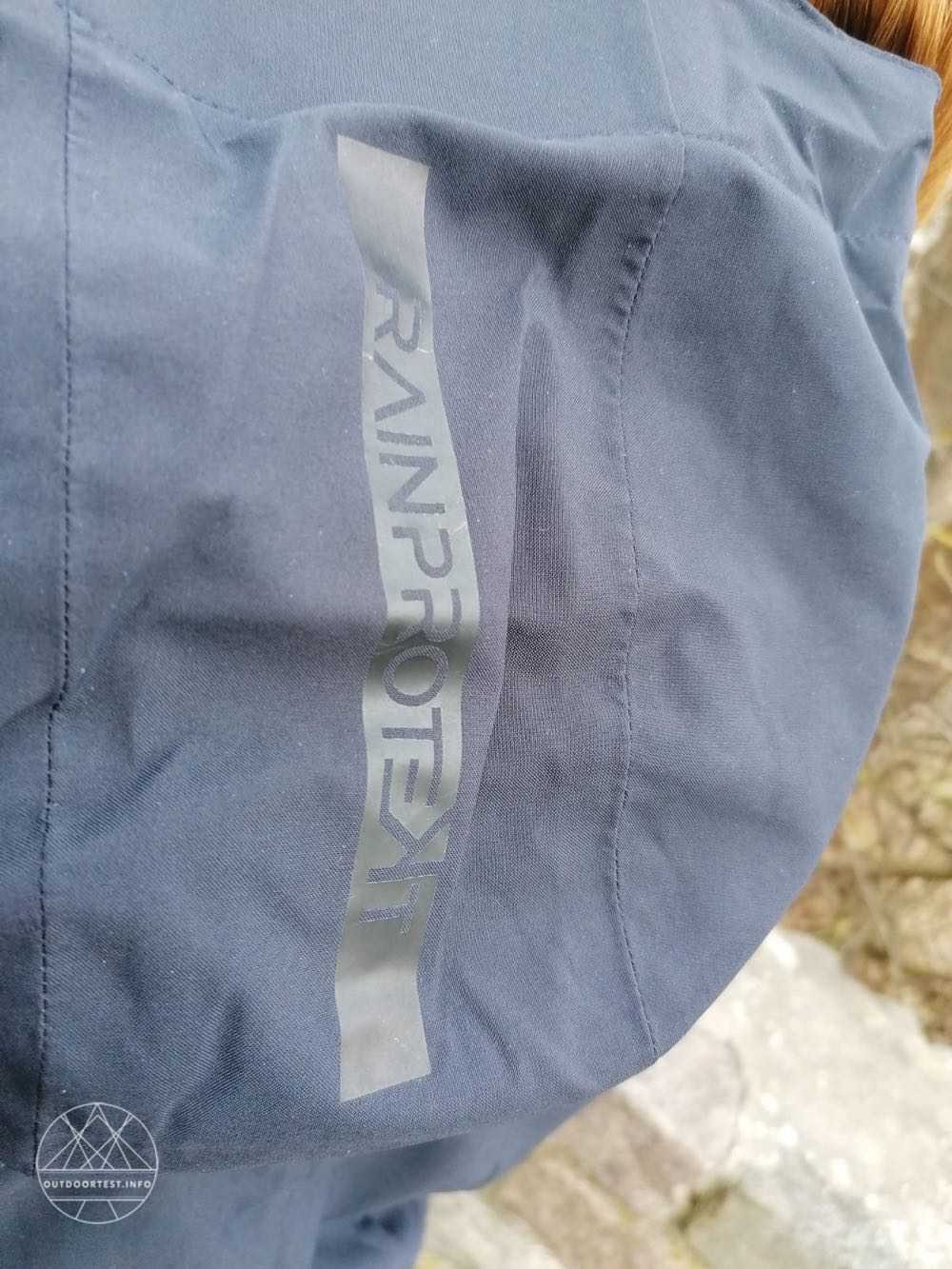 Sowohl auf der Kapuze als auch auf der Einfassung einer Einschubtasche ist in dunkelblau der Aufdruck Rainprotect aufgebracht.