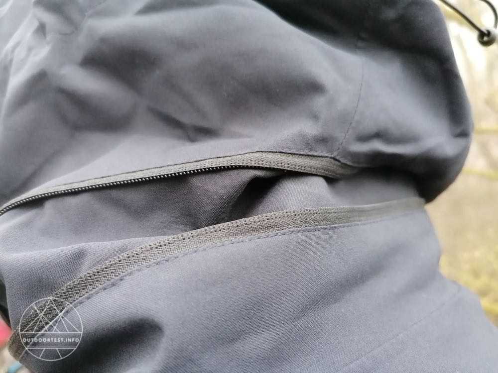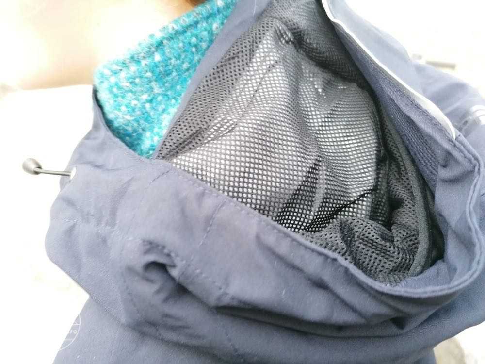 Ein großes Plus stellt auch die Kapuze dar. Sie kann mit einem Reißverschluss verkleinert oder vergrößert werden. Sie ist helmkompatibel. Dadurch sind die Kapuzen natürlich groß dimensioniert. Dies führt meist dazu, dass man sie ohne Helm so weit im Gesicht hat, dass man nichts mehr sieht. Mit der Verkleinerungsmöglichkeit ist sie eine normal große Kapuze. Diese kann zu beiden Seiten mittels Gummizug und Zipper um das Gesicht herum verkleinert werden. Am Hinterkopf befindet sich noch ein Gummizug, mittels welchem die Kapuze in der weite horizontal eingestellt werden kann.