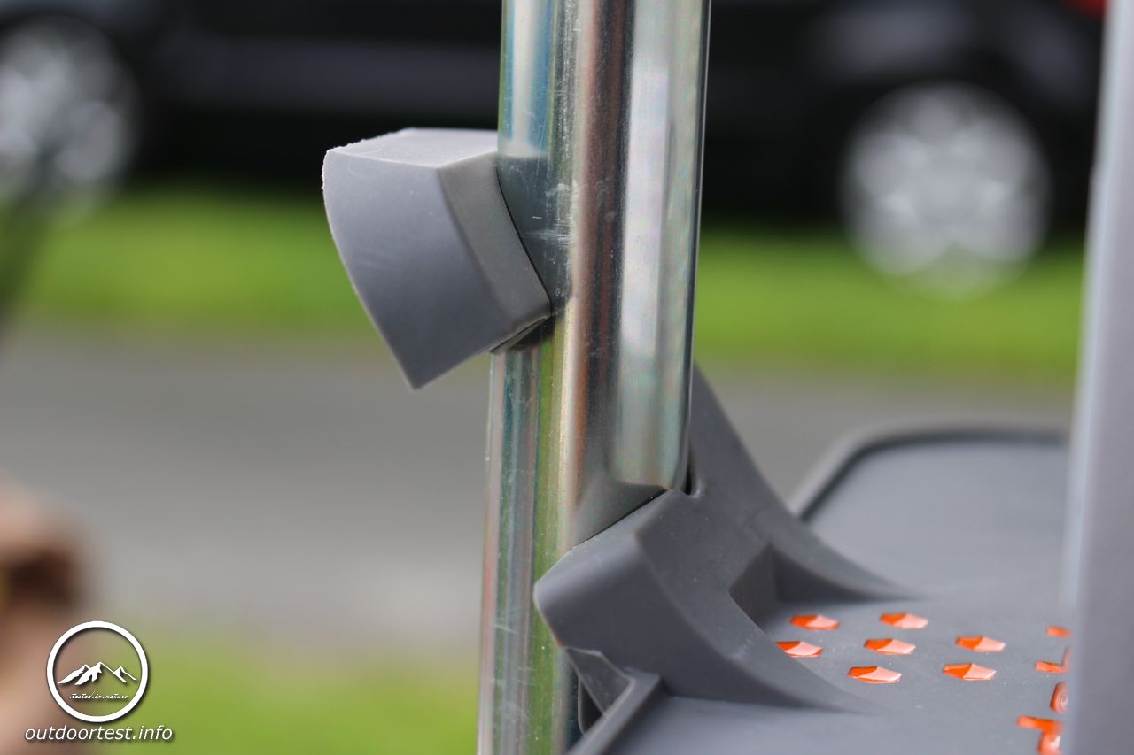 Wir hatten an unserem Vorzelt den Vorteil, dass in einer angenehmen Höhe einer der Spannverschlüsse (Power Grips) vorhanden war, auf welchem der Table dann aufsaß. Ein nahezu idealer Platz.