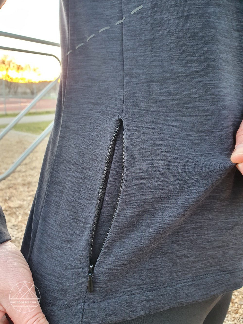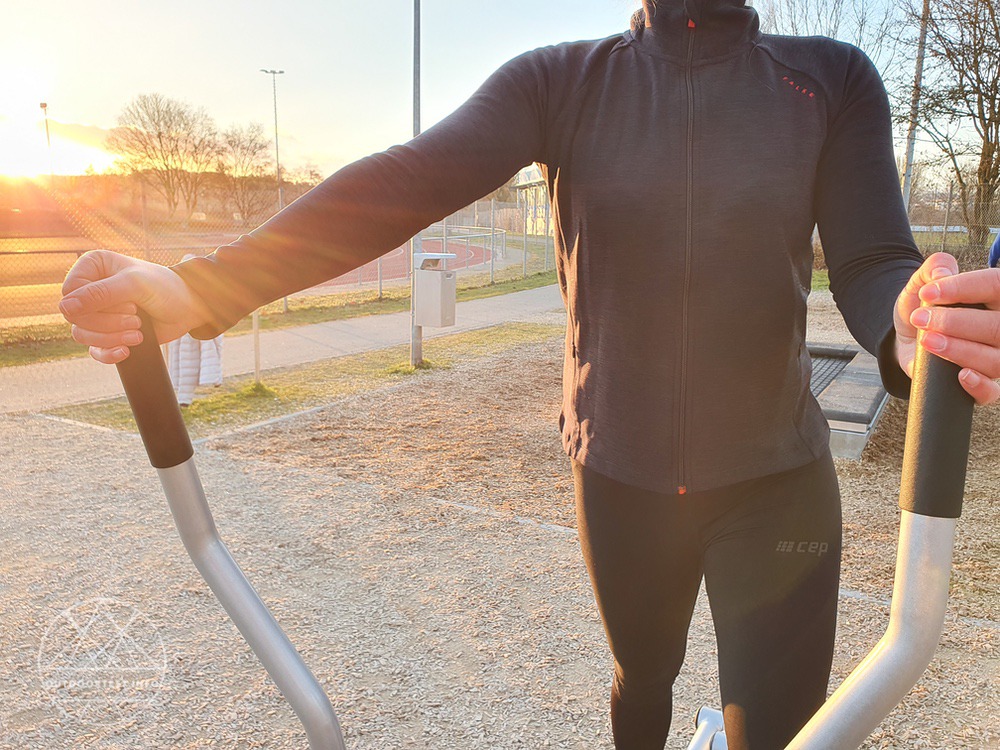 Die Core Trainingsjacke kam bei mir beim Joggen, auf dem Outdoor-Fitnesspark und auf dem Trimm-Dich-Pfad zum Einsatz. Durch die wärmende Funktion der Jacke, konnte ich sie bei Temperaturen um die 10 Grad sogar als oberste Schicht zum Laufen anziehen. Wurde es kälter oder war man eher an den Geräten im Training, kam die Core Jacke als Midlayer mit einer dünnen Windjacke darüber zum Einsatz. Die Atmungsaktivität war auch als Midlayer gegeben, da die Feuchtigkeit gut vom Material aufgenommen und vom Körper weg transportiert wurde. Die Haut hat sich unter der Jacke stets trocken angefühlt. Nach wirklich schweißtreibenden Laufeinheiten, konnte ich feststellen, dass das Material außen auch schnell wieder abtrocknet. Insgesamt herrscht ein tolles Klima unter der Jacke.