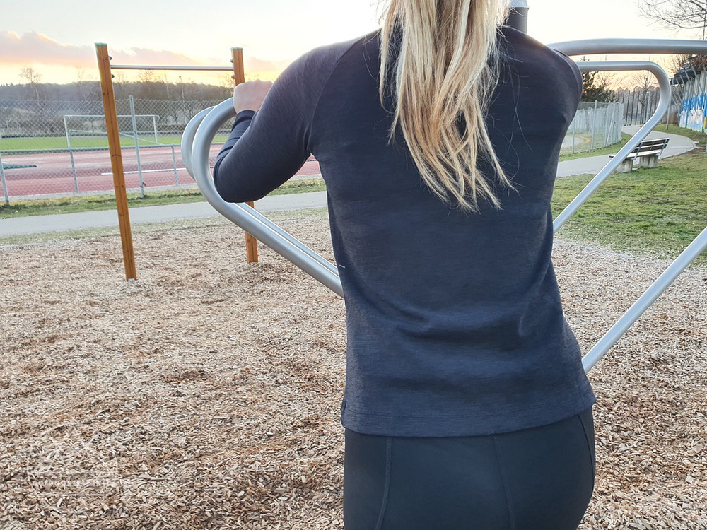 Selbst bei ausholenden Bewegungen an den Geräten mit den Armen, hat das Oberteil alles mitgemacht ohne einzuschränken. Einziger Kritikpunkt ist, dass bei Übungen mit nach oben gestreckten Armen die Jacke so weit nach oben rutscht, dass der Bauch ein Stückchen frei liegt. Die Jacke könnte für meine Bedürfnisse daher etwas länger geschnitten sein.