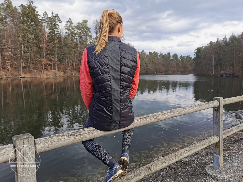 Ich empfinde die Weste als sehr atmungsaktiv. Klar, da schon alleine durch den ärmellosen Schnitt kein Stau von Feuchtigkeit entsteht. Aber auch unter den wattierten Teilen entsteht kein unangenehmes Klima. Im Bereich des Rückens sorgt auch der Mesh-Einsatz entlang der Wirbelsäule für angenehme Luftzirkulation. Gerade bei Wanderungen mit Rucksack eine tolle Sache, da man gerade unter dem Rucksack oft ins Schwitzen gerät und so ein stückweit die Feuchtigkeit nach außen ableiten kann. Ganz trocken bleibt mein Rücken bei schweißtreibenden Sportarten zwar nicht, aber durch das Mesh-Material ist eine schnelle Trocknung garantiert.