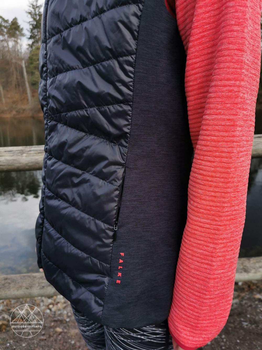 Der leicht taillierte Schnitt sorgt dafür, dass sie schön am Körper anliegt. Die Weste ist – mit ca. 68 cm hinten und 65 cm vorne – recht lang geschnitten, was mir persönlich sehr gut gefällt. So kommt gerade im Bereich der Hüfte die Kälte nicht so schnell nach innen. Der Ausschnitt für die Arme ist genau richtig gewählt, so dass die Bewegungsfreiheit der Arme nicht einschränkt wird und man auch noch einen Midlayer darunter tragen kann. Für ausreichend Flexibilität sorgt auch der Einsatz eines Stretchmaterials an den Seiten der Weste. Der passt sich nämlich aufgrund seiner Elastizität sehr gut an den Körper an.