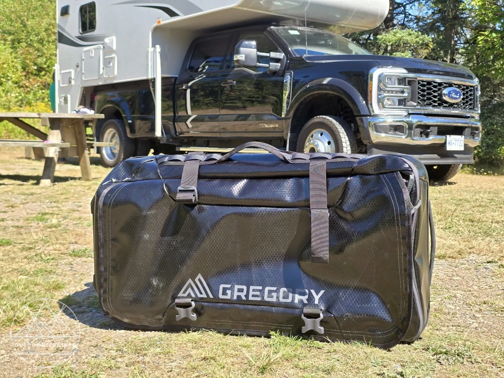 Die Verarbeitung insgesamt ist Gregory-typisch: durchdacht, hochwertig, kompromisslos. Die Tasche wirkt eher wie ein Expeditionsbegleiter als wie eine Reisetasche. Und genau das wollten wir, denn sie soll uns auf eine Abenteuerreise nach Kanada begleiten. Trotz dessen ist die Rolling Duffle dabei auch noch sehr leicht – weniger als 4 Kilo bringt sie leer auf die Waage.