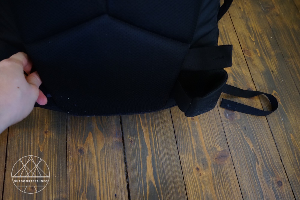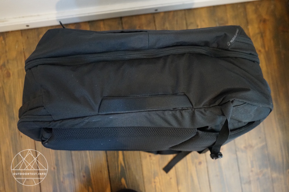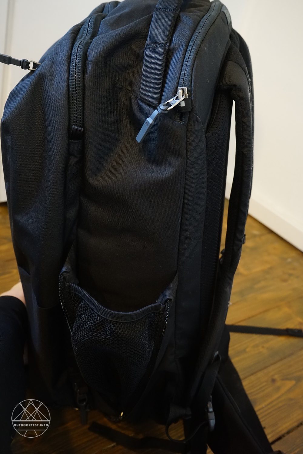 Der Rücken sowie die Schultergurte sind mit atmungsaktivem Airmesh gepolstert. Das Rückenpolster hat oben zwei kleine Schlitze, sodass auch der Raum zwischen Polster und Rückwand genutzt werden kann, wenn der Border Carry-On nicht als Rucksack sondern als Tragetasche verwendet werden soll. Schulter- und Hüftgurte können hier verstaut werden. Seitlich ist noch eine kleine Tasche mit Reisversschluss. So können hier je nach Bedarf entweder Tempos oder eine Trinkflasche Platz finden. An drei Seiten des Rucksacks befinden sie gepolsterte Tragegriffe.