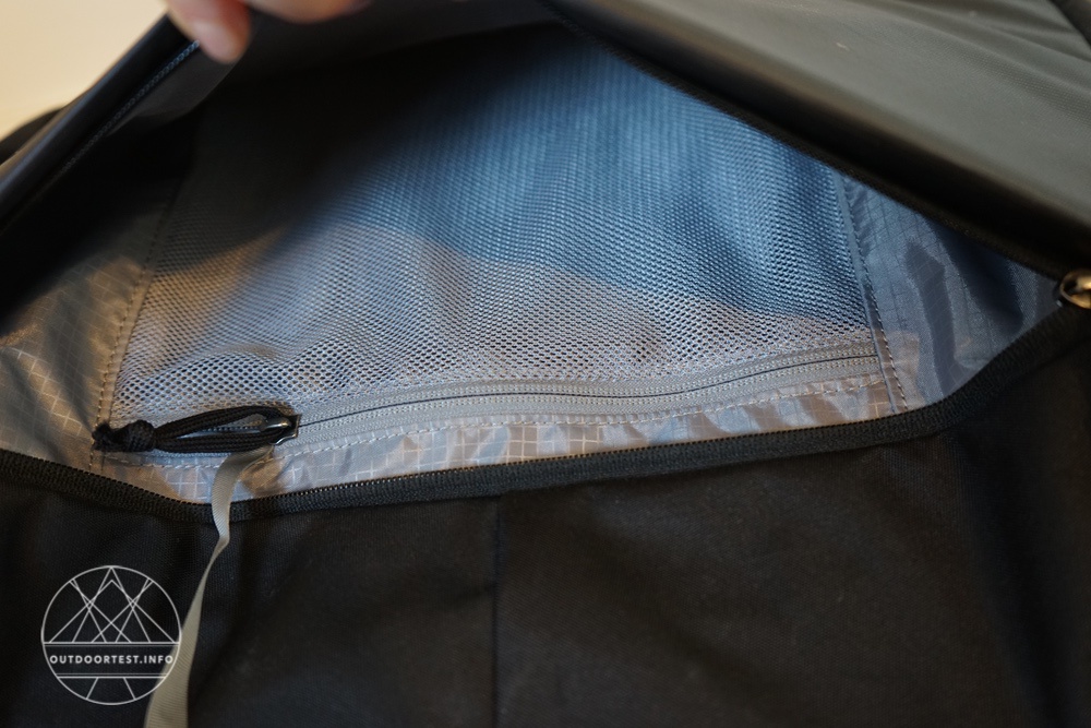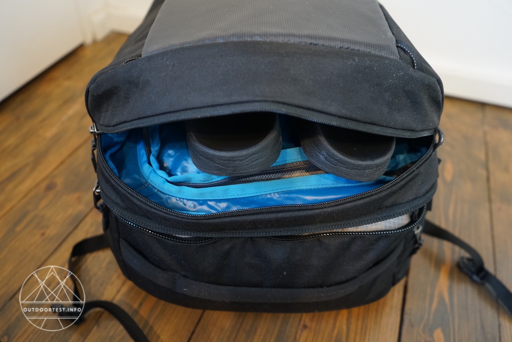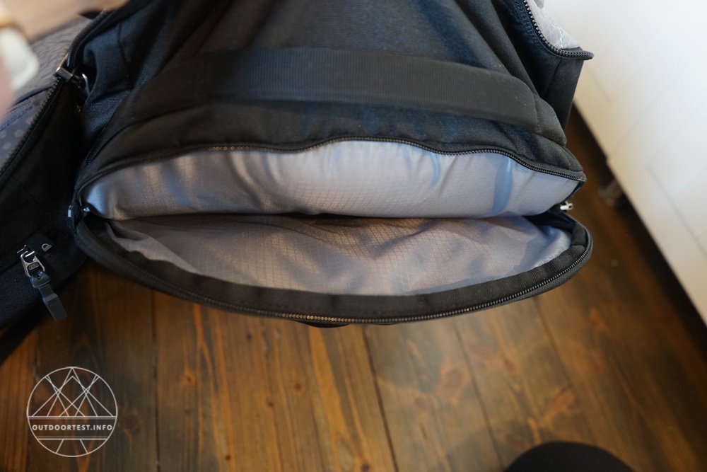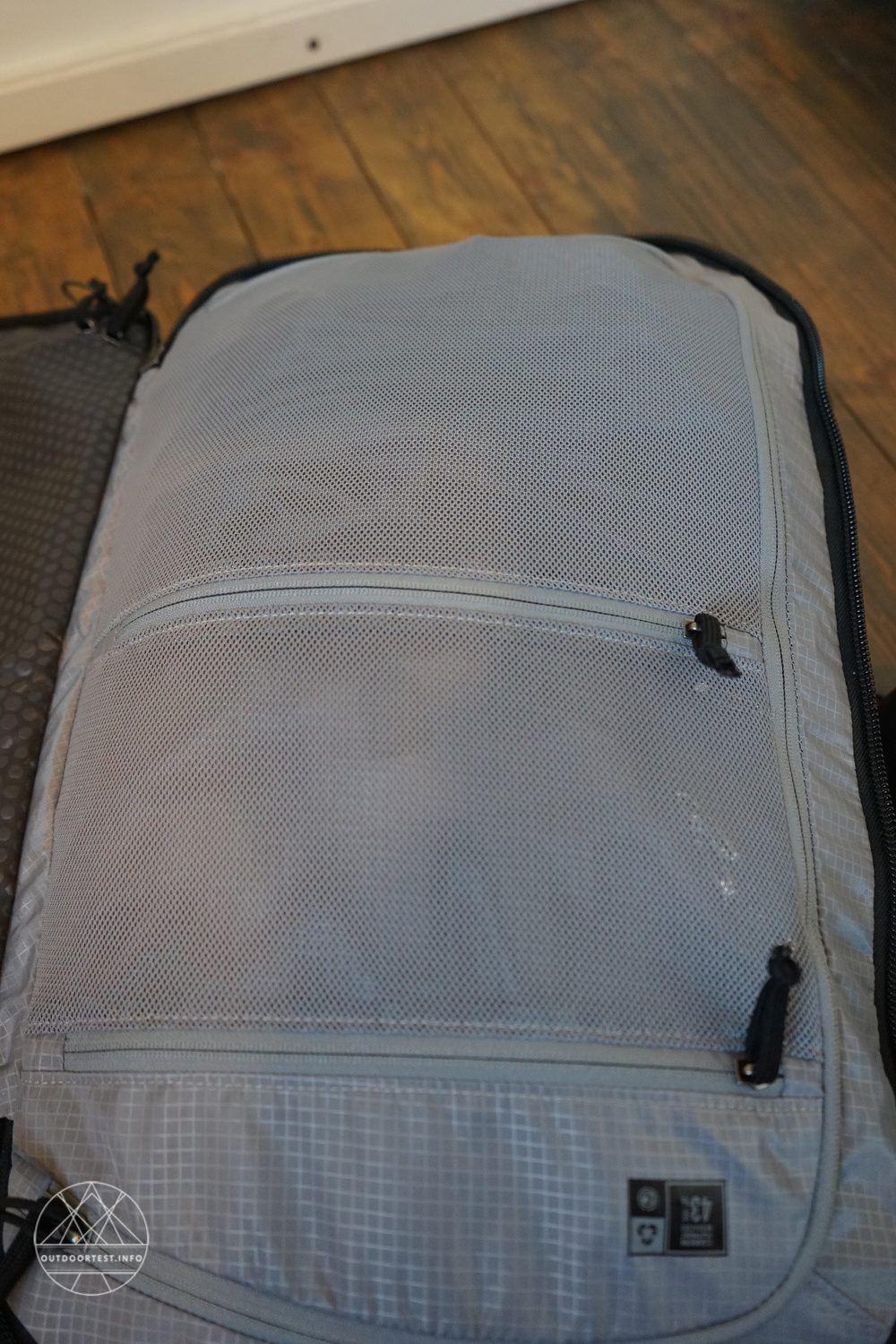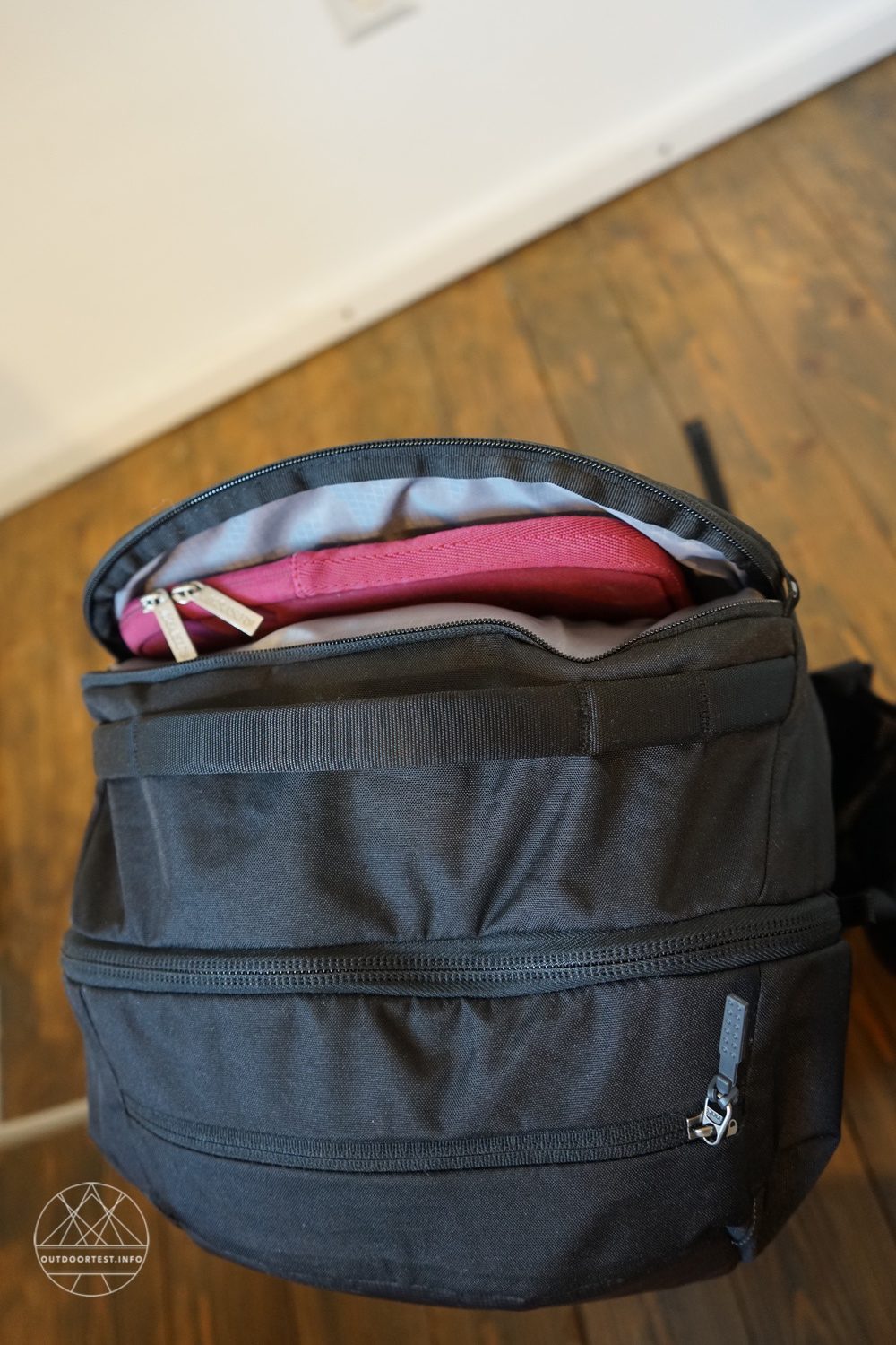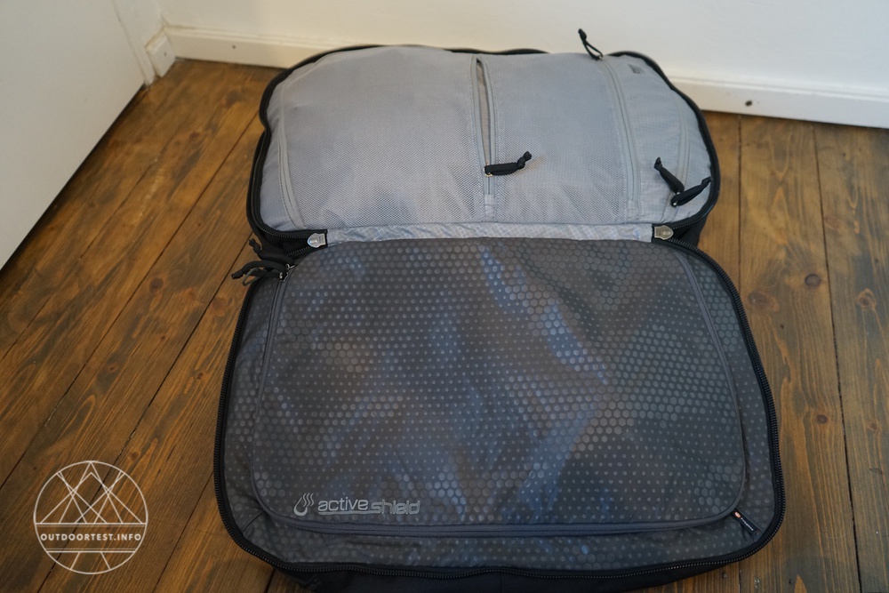Dahinter befindet sich schon das größte Fach – bzw. beide Fächer. Denn öffnet man den Reißverschluss, wird der Rucksack nur noch an der rechten Seite fixiert und teilt sich in zwei Hälften, liegt also wie ein Koffer geöffnet da. Eine Seite, das Active Shield Compartment, ist aus wasserdichtem Material. Hier kann nasse oder schmutzige Kleidung und Ausrüstung problemlos verstaut werden. Sie lässt sich auch von unten öffnen, sodass z.B. schmutzige Laufschuhe direkt hineingesteckt werden können, ohne den gesamten Rucksack zu öffnen. Die andere Seite ist ganz klassisch aus demselben Material wie der das restliche Innenleben des Rucksacks. Auf ihrer Oberseite befinden sich wieder zwei Mesh-Taschen, praktisch für Socken, Unterwäsche oder „Kleinkram“. Theoretisch kann man zwischen die beiden Fächer etwas Flaches packen, Laptop, Tablet etc. finden aber direkt hinter dem Rücken Platz. Das Laptopfach ist 15.6 Zoll groß.
