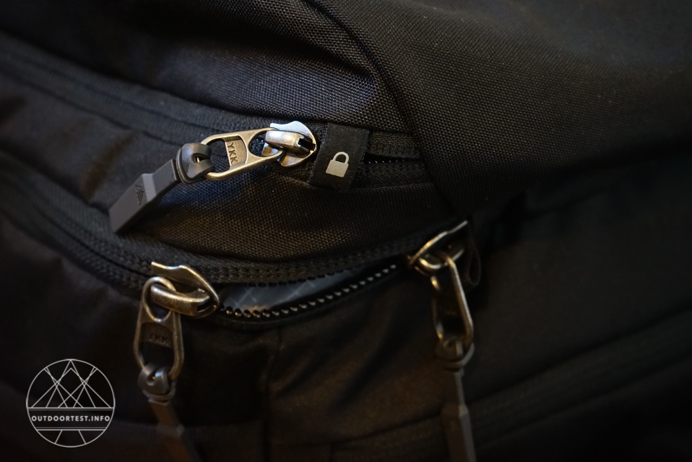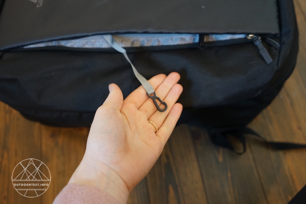 Der Border Carry-On 40 wirkt hochwertig und durchdacht: Seine Gestaltung ist so optimiert, dass der Rucksack an verschiedenen Stellen eine Überraschung parat hat. Die Front ist etwas verstärkt und wasserabweisend beschichtet, sodass sie den Inhalt zum einen schützt und zum anderen selbst nicht so schnell Abnutzungsspuren bekommt. Direkt hinter der Front ist ein kleines Fach mit Mesh-Taschen, in denen sich Kabel, Schlüssel (am integrierten Schlüsselhaken) und sonstige Kleinigkeiten super verstauen lassen. An der Oberseite befindet sich auch weit vorn ein kleines Fach, das ich für Tempos etc. genutzt habe. Es passt aber auch ein Portmonaie hinein. Besonders praktisch: wie bei einigen anderen Fächern ist auch hier ein „Schloss“ angebracht. Dabei handelt es sich einfach um eine Stoffummantelung des Reißverschlusses, in die der Reiter hineingeschoben werden kann. Das erschwert das Öffnen, sodass Langfinger sich nicht im Vorbeigehen bedienen können.