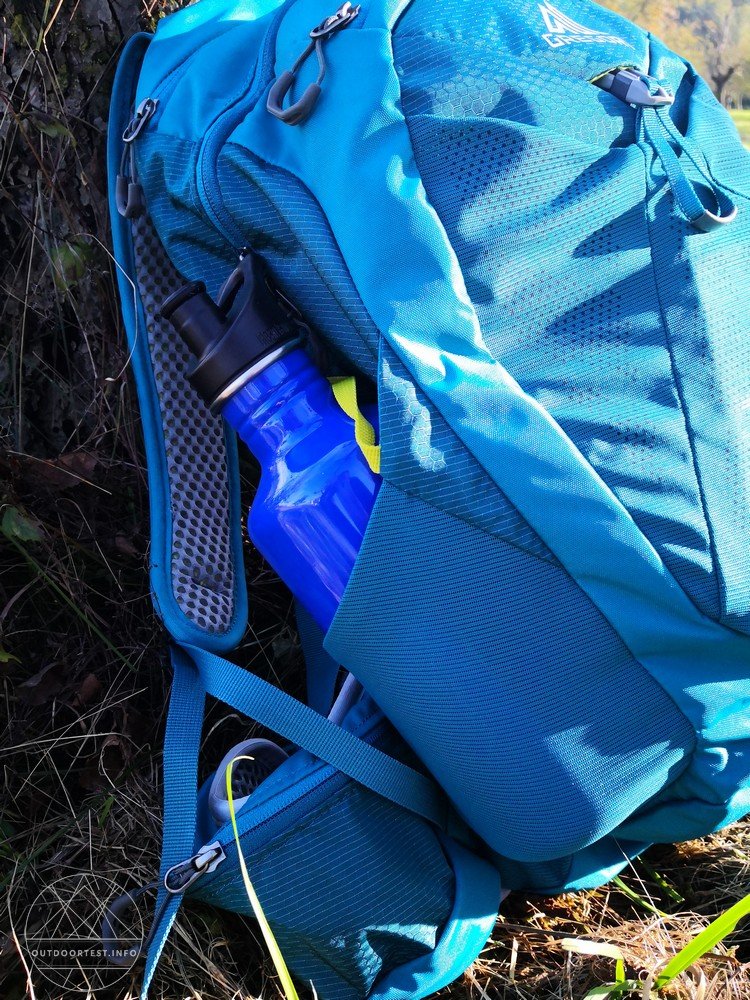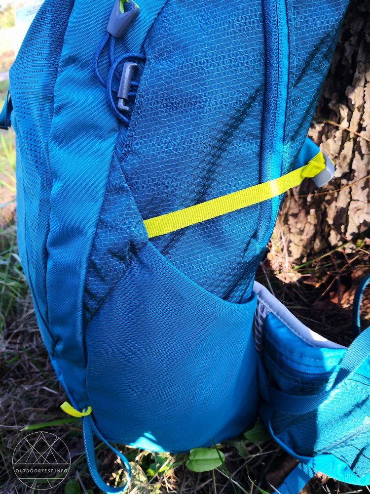 In den seitlichen Mesh-Fächern findet gut eine 1,5 Liter Flasche Platz, die aufgrund des darüber angebrachten dünnen Gurtes auch oben gut fixiert werden kann.