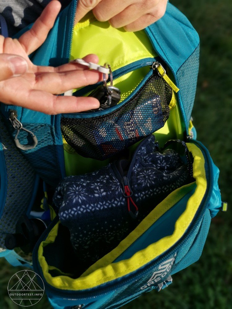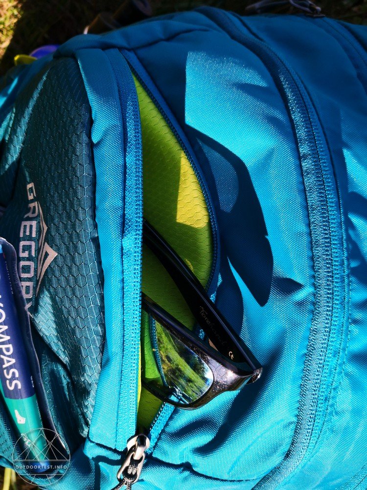 Das erste Reißverschlussfach, welches sich am nächsten zum Rücken befindet, ist vorrangig für eine Wasserblase gedacht. Der Reißverschluss ist dafür nur im oberen Bereich zu öffnen, was für das Verstauen der Trinkblase ausreichend ist. Das Fach reicht bis zum Rucksackboden und verfügt oben über einen Haken, der perfekt zum Einhängen der Gregory eigenen Wasserblase „Gregory 3D Hydro Reservoir“ passt. Unter dem Haken befindet sich noch eine kleine Schlaufe, so dass auch andere Modelle von Wasserblasen befestigt werden können und ich letztendlich meine eigene Wasserblase einer anderen Marke prima verwenden kann! Eine tolle Sache! Aufgrund der Größe des Fachs, passt sogar ein 3 Liter Wasserreservoir ohne Probleme rein, aber der Platz geht natürlich dann am Hauptfach verloren.