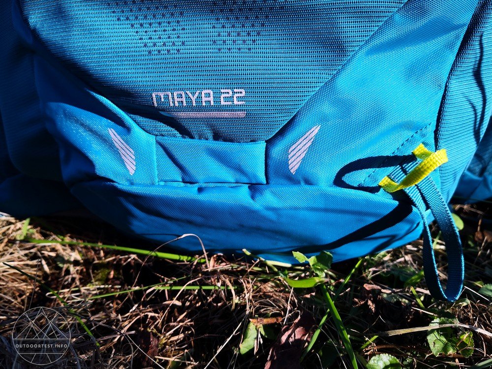 Der Maya verfügt außen über 3 Fächer aus Mesh-Material. Zwei davon seitlich und das größte auf der Front des Rucksacks.
