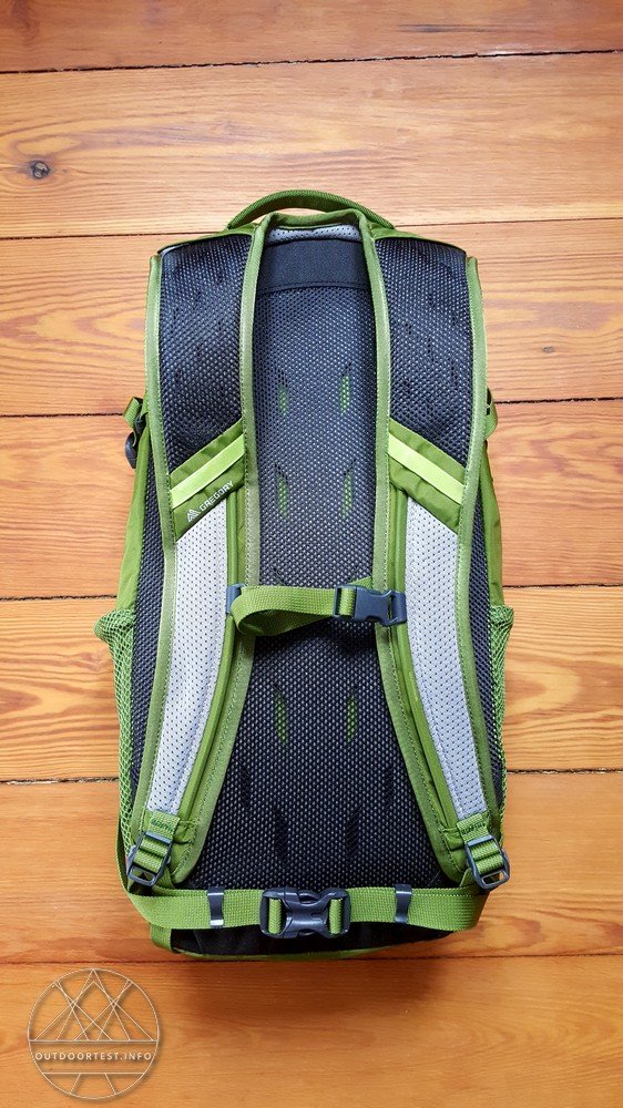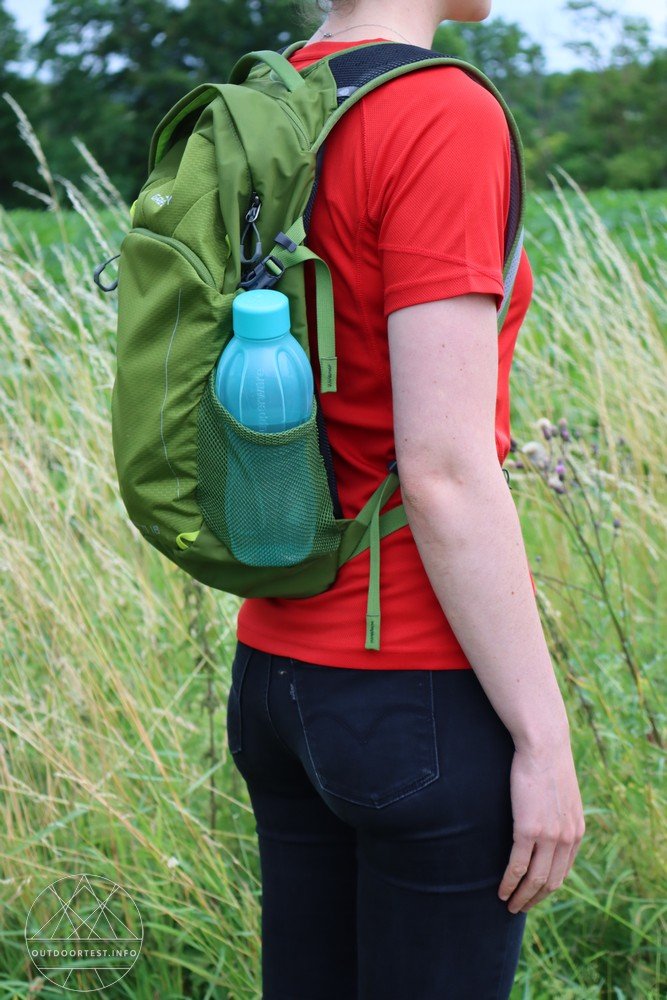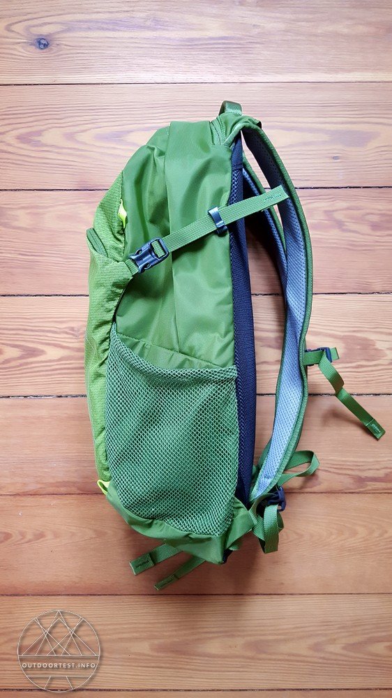 An den beiden äußeren Seiten befinden sich zwei Netztaschen, in die man z.B. Trinkflaschen, eine Luftpumpe oder einen Schirm packen kann. Zudem sind an den Seiten zwei Kompressionsriemen angebracht, mit denen man den Rucksack enger stellen kann, wenn man den Stauraum nicht vollständig ausgefüllt hat.