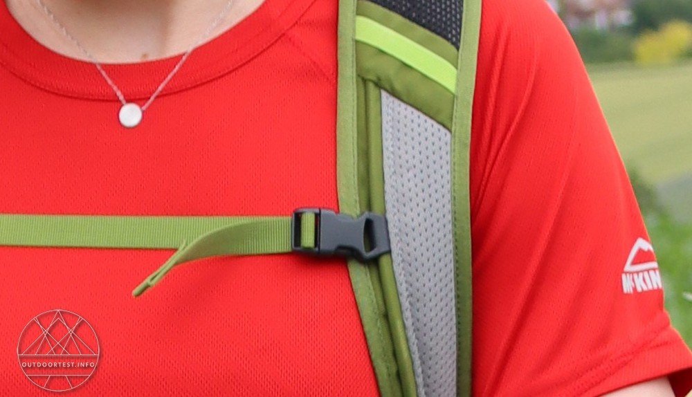 Um die Trinkblase sicher und aufrecht im Rucksack zu befestigen, ist oben im Fach eine Clip-Halterung angebracht und der Trinkschlauch kann durch eine Öffnung zwischen dem Trinkblasenfach und Schultergurten nach Belieben entweder auf der linken oder der rechten Seite der Schultergurte geführt werden. Um den Trinkaufsatz beim Laufen sicher zu befestigen, befinden sich mittig an den Schultergurten Gummilaschen.