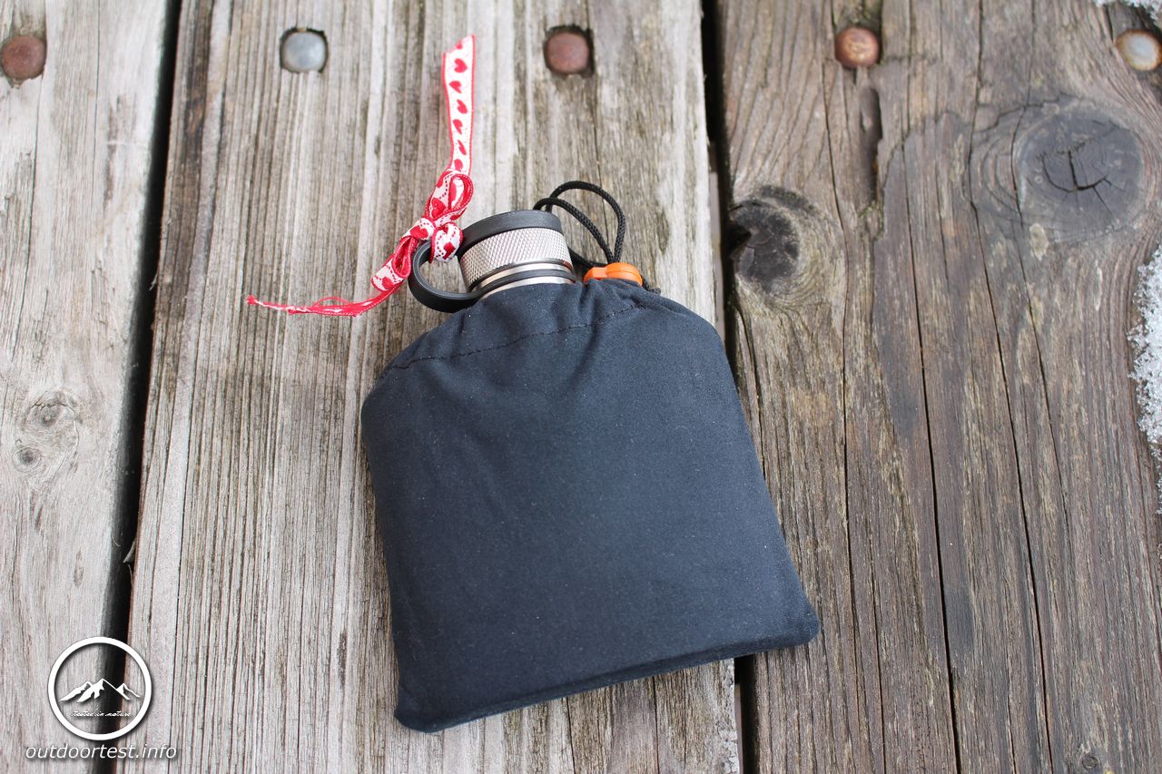 Will man das Material vor Beschädigungen schützen, dann kann man den Flachmann auch gerne in dem ebenfalls mitgelieferten schwarzen Stoffbeutel verstauen, der sich oben mittels Kordelstopper enger machen lässt. Dieser verhindert auch entsprechende Fingerspuren auf der Oberfläche.