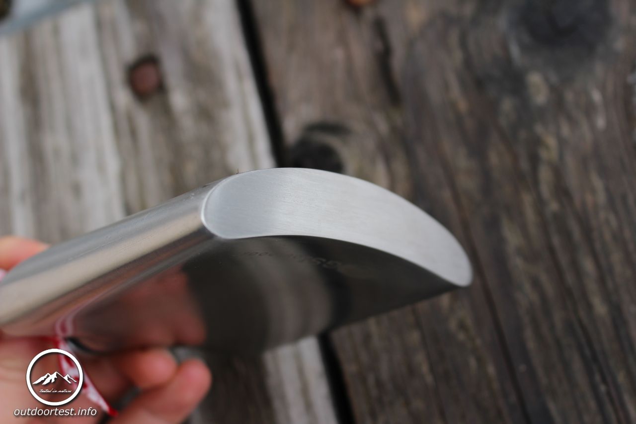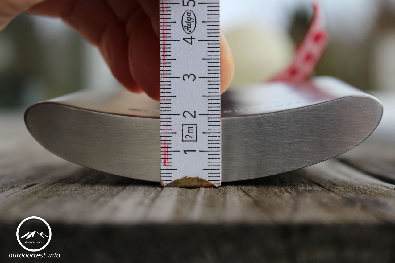 Nicht ganz so praktisch hat sich für uns die Form erwiesen. Der Flachmann läuft, wenn man ihn von der Seite betrachtet, nach unten schmal zu, also konisch. Dies mag zwar optisch nett sein, hat aber den Nachteil, dass der Flachmann dadurch eine kleinere Stellfläche hat und unter Umständen umfallen kann. Man hat in den Bergen leider nicht immer eine Tischplatte oder eine ganz glatte Stellfläche zur Verfügung. Und gerade wenn der Stoffbeutel verwendet wird, kippt der Flachmann noch viel schneller um.