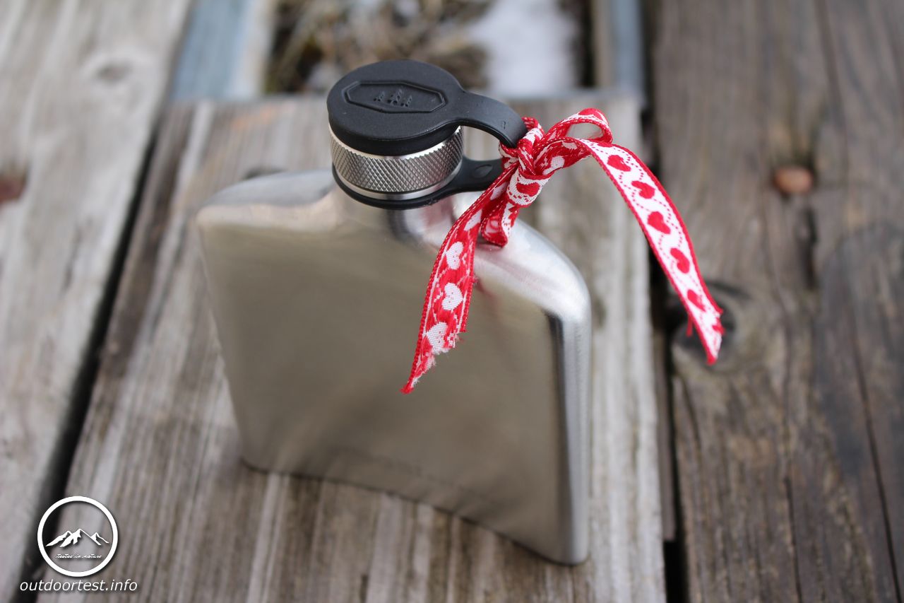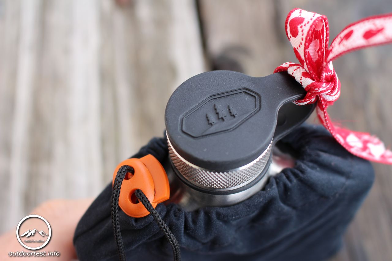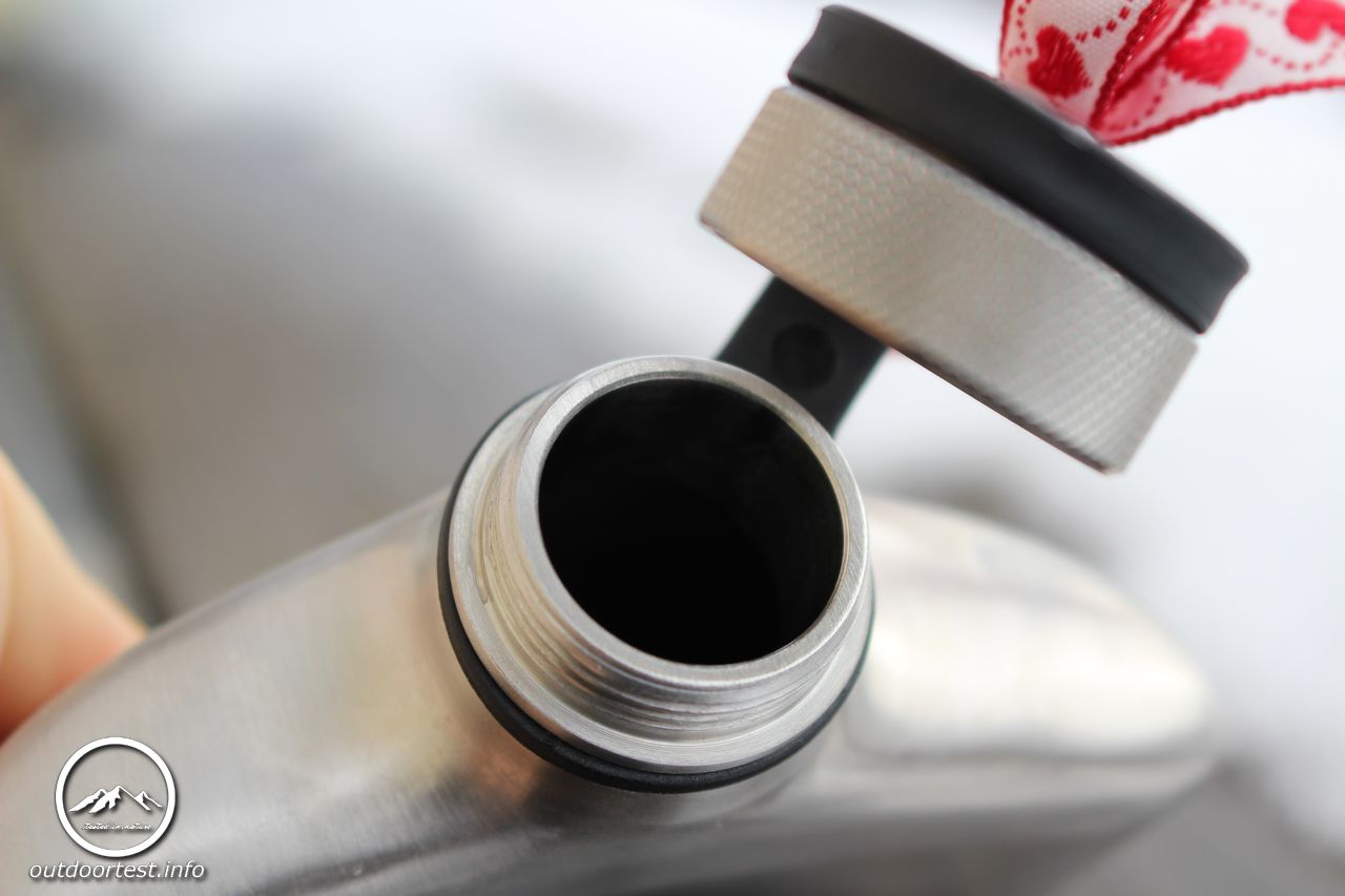 Der Verschluss lässt sich gut bedienen und um dem Deckel nicht zu verlieren, wurde dieser mit einem schwarzen Kunststoffband am Hals des Flachmannes befestigt.