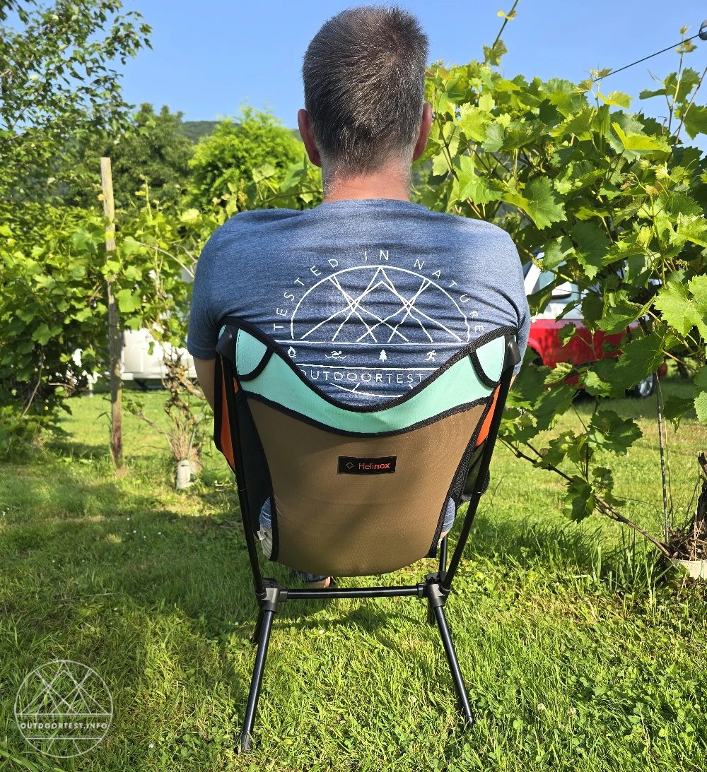 Der Stuhl ist natürlich ein Kompromiss aus Packmaß und Sitzgröße. Das Rückenteil endet knapp unter den Schulterblättern. Es gibt auch von Helinox Stühle mit höher gezogenen Rückenlehnen, aber das braucht ja alles Platz. Wir finden, der Chair One (re) ist ein guter Kompromiss – man sitzt sehr bequem, seitlich stabilisiert und hält es auch einen langen, gemütlichen Nachmittag darin gut aus. Fürs Getränk oder Handy gibt es sogar eine flache Tasche auf der rechten Seite – gerade groß genug für eine Dose oder eine 0,3l-Flasche.