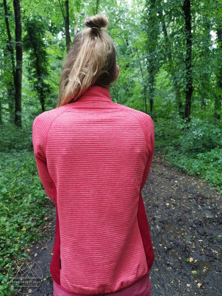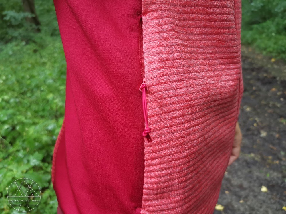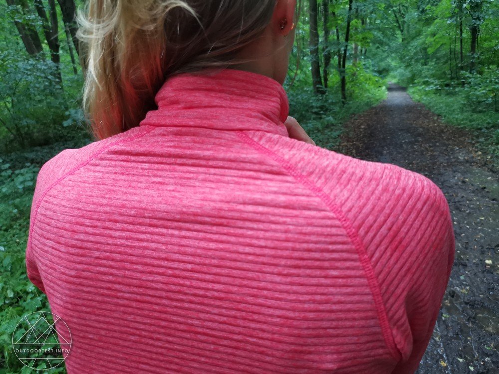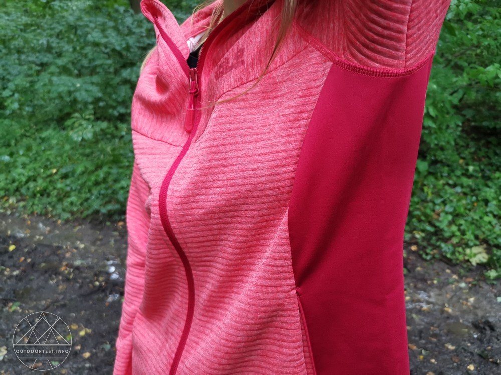 Die Jacke besteht aus zwei verschiedenen Fleecestoffen. Der größte Teil (Front, Rücken und Ärmel) aus dem geriffelten Fleece und an den Seiten wurde ein besonders strechfähiger Fleece gewählt. Beide Stoffe sind so elastisch, dass ich bei keiner sportlichen Aktivität in der Bewegung eingeschränkt wurde.