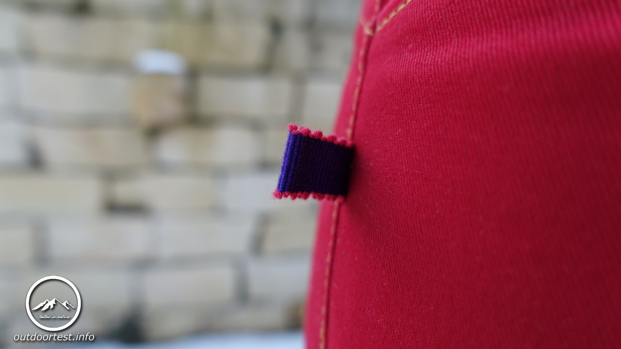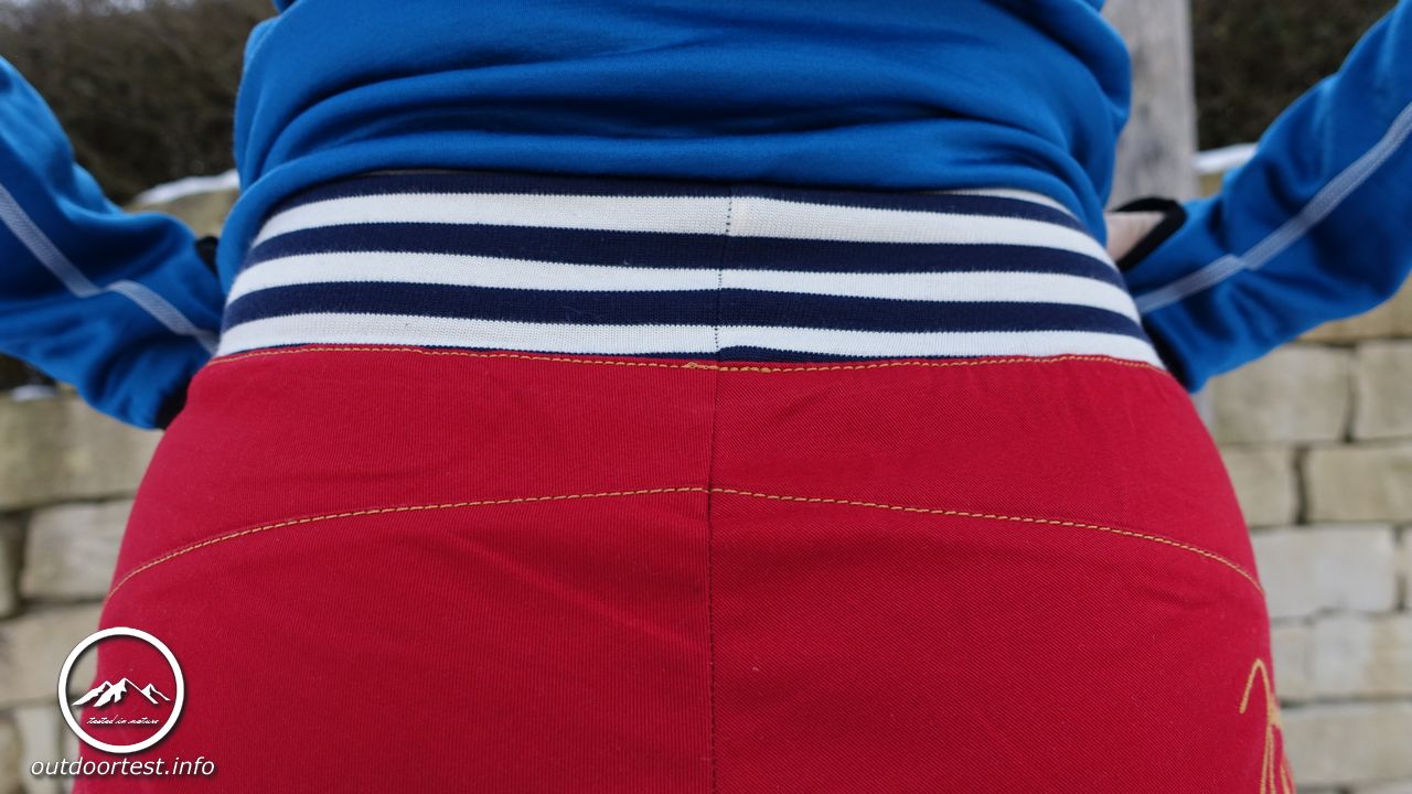 Der hohe Bund ist sicherlich sowohl ein optisches Highlight als auch ein praktisches Detail dieser Kletterhose. Das Ringeldesign an sich hat ein klein wenig etwas vom Matrosenlook. Allerdings in der Kombination mit der restlichen Hose ist es einfach ein nettes Detail. Die Höhe des Bundes sorgt für perfekten Sitz. Er schmiegt sich um die Taille und verleiht einem das Gefühl sicher und gut angezogen zu sein. Egal, welche Bewegungen FRAU auch macht, gibt es kein Zupfen oder Freilegen des Nierenbereichs.