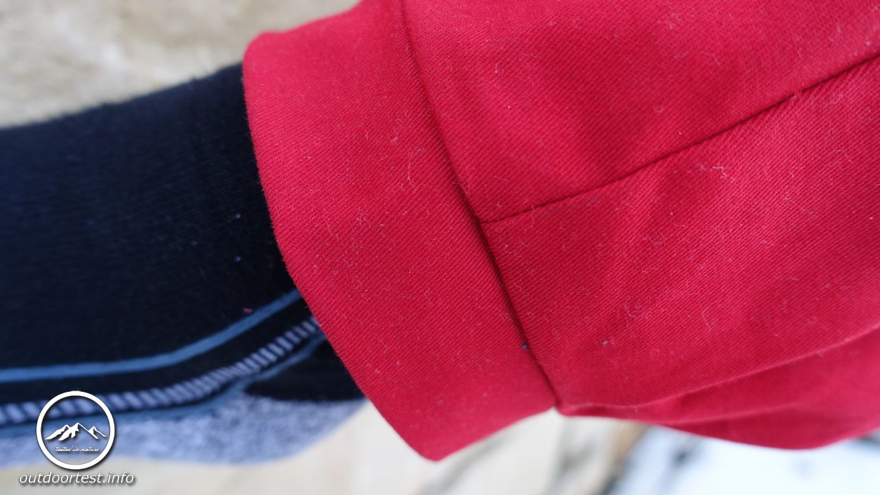 Der Hosenbeinabschluss ist mit einem Bündchen versehen. Hier ist die Beinweite in Bundfalten im Bündchen eingefasst. Das Bündchen selbst hat eine angenehme Weite und ist aus dem selben Gewebe wie die Hose selbst. Dies hat allerdings zur Folge, dass sie so gut wie nicht dehnbar sind. Beim An- und Ausziehen macht dies keine Probleme. Allerdings ist es der Testerin nicht möglich gewesen, die Bündchen über die Wade hoch zu ziehen, wenns mal heiß her geht. So kann es passieren, dass es einem schon mal zu heiß wird bei entsprechender Anstrengung und dem kräftigen Stoff.
