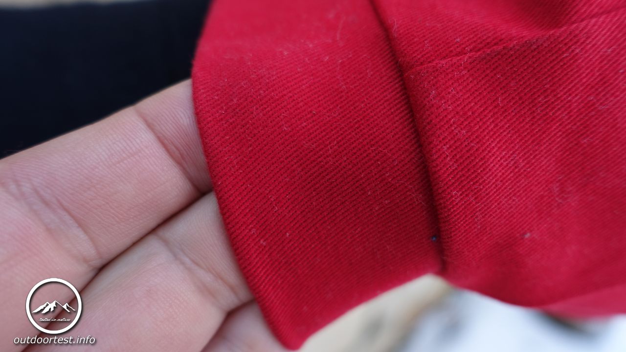 Die Nähte sitzen trotz des recht unbeweglichen und festen Stoffes gut. Die starke Farbe bleibt trotz mehrmaligem Waschen leuchtend und die Farm stabil.