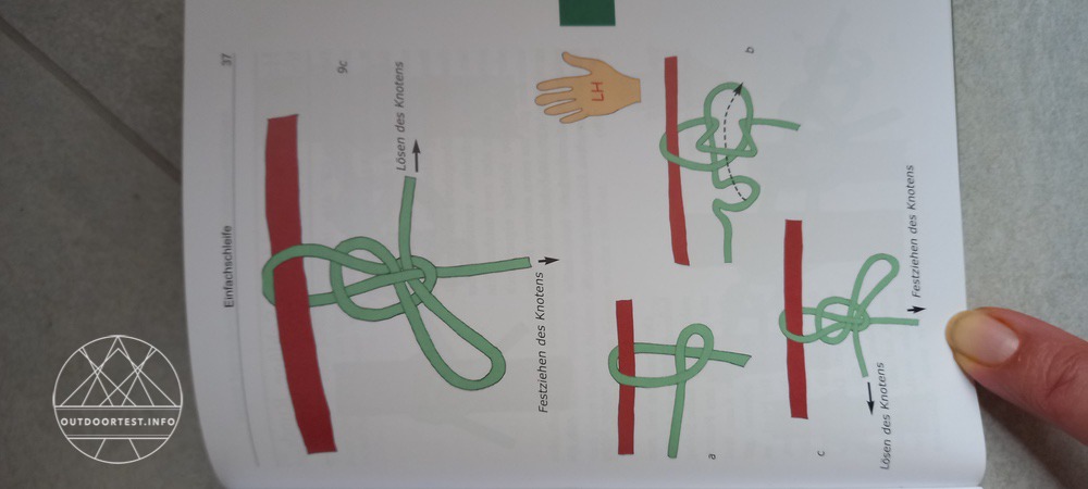 Besonders erfreulich ist, dass viele Knoten nicht nur für Rechtshänder sondern explizit auch für Linkshänder erläutert werden. Dies ist insofern wichtig, da nicht alle Knoten einfach von links auf rechts übernommen werden können. Dies gilt insbesondere für kompliziertere Knoten. Die Linkshändervariante ist mit einer gezeichneten Hand und den roten Buchstaben LH dargestellt. Dann werden noch Angaben zur Knotenfestigkeit gemacht. Dies ist dann wichtig, wenn es einem speziell auf die Festigkeit eines Knotens ankommt. Es gibt aber auch andere Kriterien, die für die Knotenauswahl entscheidend sein können. Vor allem die Einfachheit der Handhabung oder aber auch das schnelle Lösen eines Knotens. In der Reiterei werden zum Beispiel gerne zum Anbinden eines Pferdes sogenannte Panikknoten verwendet, bei denen durch einen schnellen Zug am lockeren Ende des Seiles der Knoten sofort zu lösen ist.