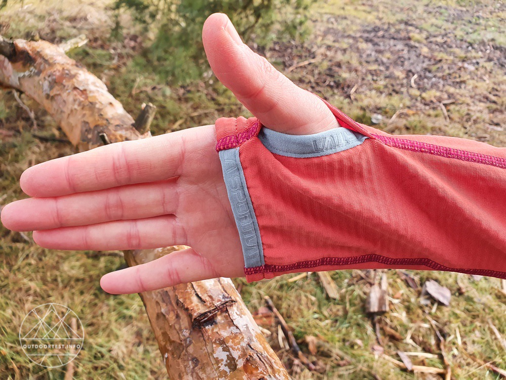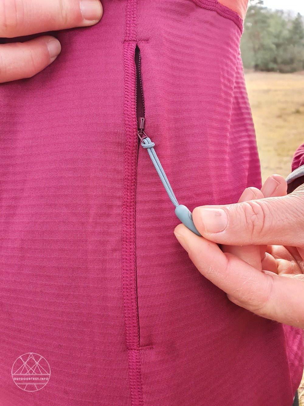 Die Seitentaschen sind mittels Reißverschluss und einer grauen Ziphilfe zu öffnen. Der Reißverschluss ist nach innen verlegt, mit Stoff überdeckt und wird so im geschlossenen Zustand nicht wahrgenommen. Die Taschen sind geräumig genug, um alle wichtigen Gegenstände immer griffbereit verstauen zu können. Innen sind die Taschen mit einem ganz leichten und perforiertem Stoff ausgeführt, damit unter den Taschen nicht geschwitzt wird. Ganz leichte Gegenstände wie Taschentücher könnten im Inneren auch von oben hinter die Tasche eingeschoben werden. Ein weiteres für mich persönlich sehr wichtiges Detail, ist das Daumenloch am Ende des Ärmels. Sind die Temperaturen mal etwas kühler, kann man so seine Hand bedecken und mit dieser trotzdem noch agieren oder Stöcke greifen.