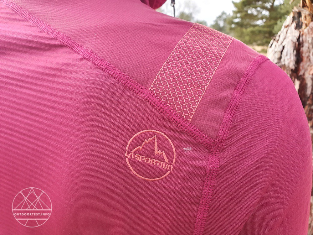 Der Saum um die Kapuze, die Unterseite der Ärmelbündchen, sowie der Abschluss unten an dem Hoody sind mit einem grauen, sehr elastischem Band eingefasst. Das gummiähnliche Band, in welches regelmäßig der Schriftzug „La Sportiva“ eingestanzt ist, sorgt für einen eng anliegenden Sitz an den Stellen, wo Wind und Kälte eindringen könnten. Eine tolle Variante um auf Kordelzüge zu verzichten.