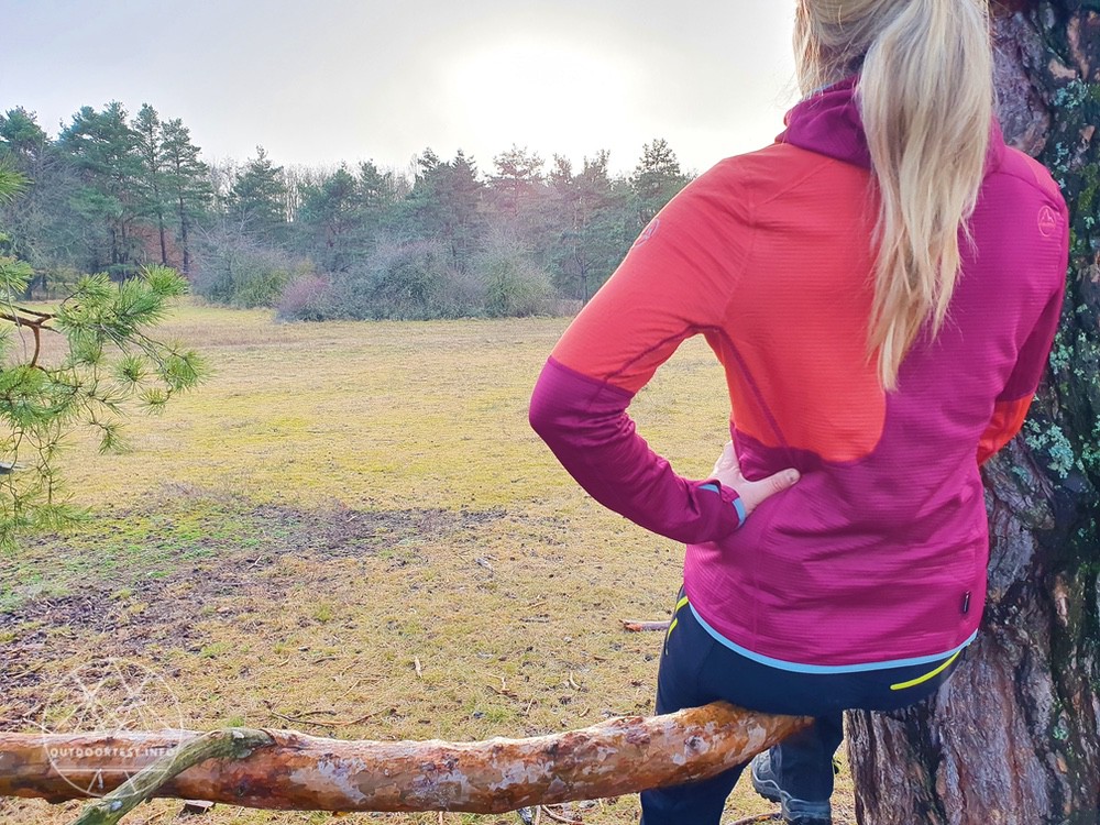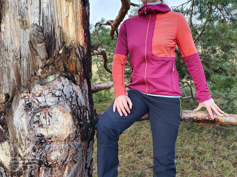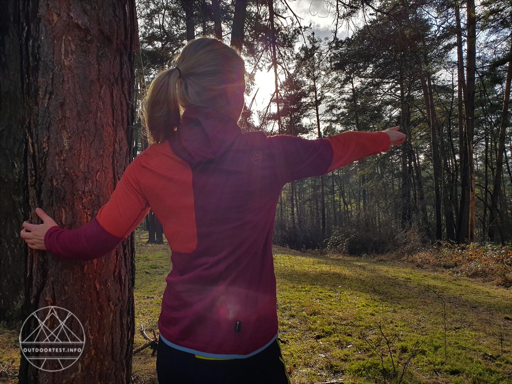 Voller Begeisterung über die Farbe „Red Plum/Paprika“ schlüpfe ich in den Granite Hoody und bin direkt verliebt in den Style. Der Hauptteil des Hoody ist in einem dunklen Pflaumenrot gehalten und die linke Schulter- und Oberarmpartie, sowie entgegengesetzt der rechte Unterarm, sind in einem helleren Paprikarot designt. Selbst der rote Frontreißverschluss und die Flachnähte in Pflaumen- oder Paprikarot fügen sich harmonisch in das Gesamtbild ein. Dieses moderne und sportliche Design ist wirklich etwas Außergewöhnliches und generiert vor allem draußen im Grünen einen tollen Hingucker. Ich wurde schon mehrfach von teils fremden Personen auf die tolle Jacke angesprochen. Es gibt den Midlayer zusätzlich in 8 verschiedensten bunten Farbvarianten, die es einem sehr schwer machen sich für eine zu entscheiden.